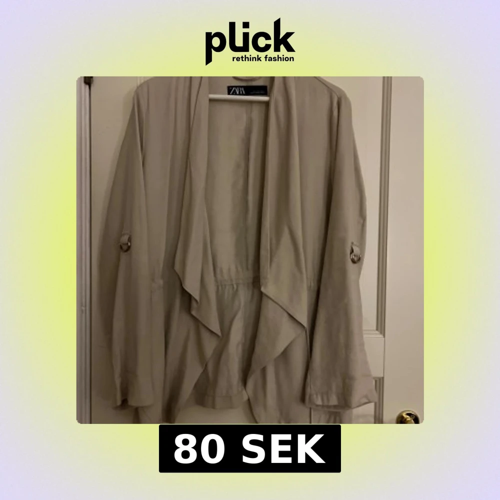 Snygg beige tunn jacka från Zara med avslappnad passform och vattenfallsframsida. Jackan har långa ärmar med dekorativa metallringar där man kan vika upp ärmarna och är tillverkad i ett mjukt, lätt tyg som ger en stilren look.