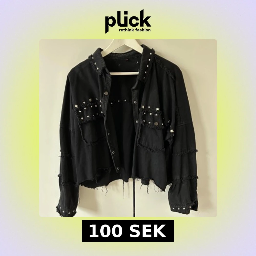Cool svart jacka med nitar på krage och fickor. Jackan har fransiga detaljer och knappar framtill. Perfekt för en edgy look.