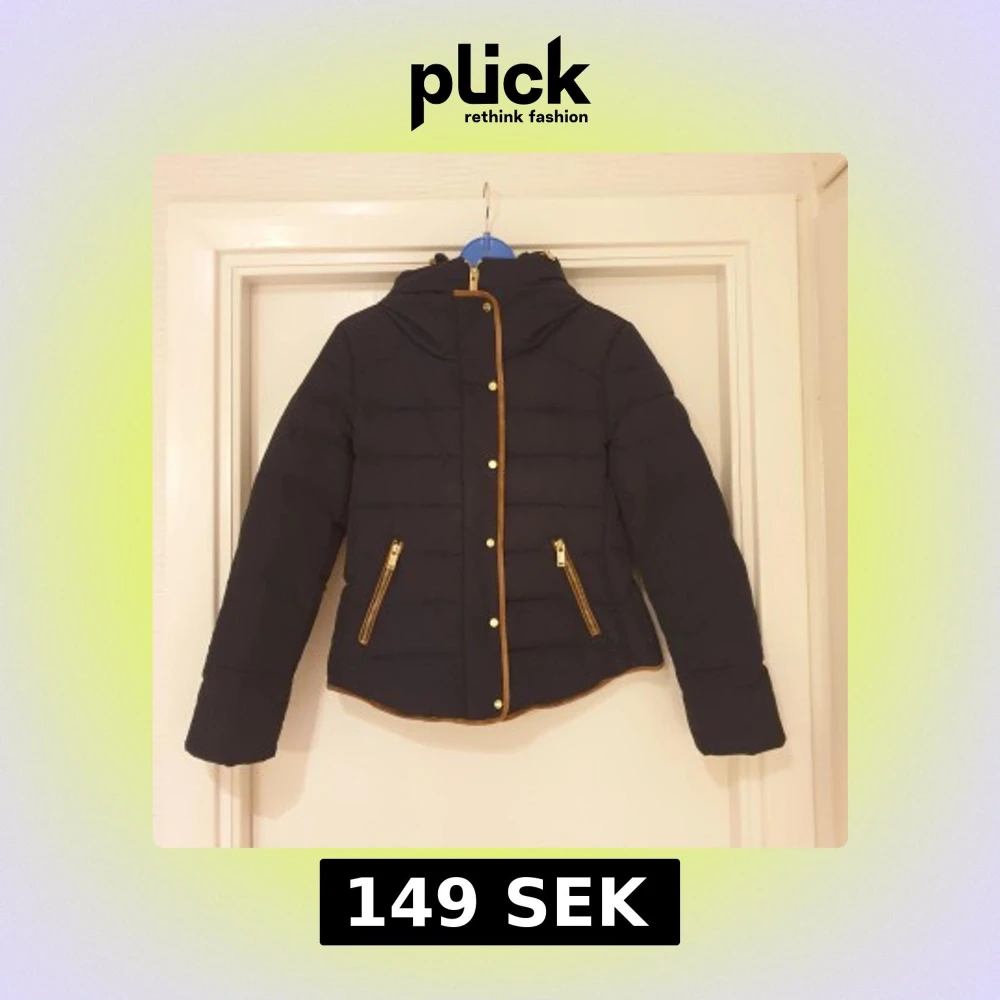 Marinblå pufferjacka från Zara Basic med guldiga dragkedjor och knappar. Jackan har huva, markerade sömmar och snygga detaljer i brunt längs dragkedjor och kanter. Perfekt för kalla dagar med sin vadderade design och långa ärmar.