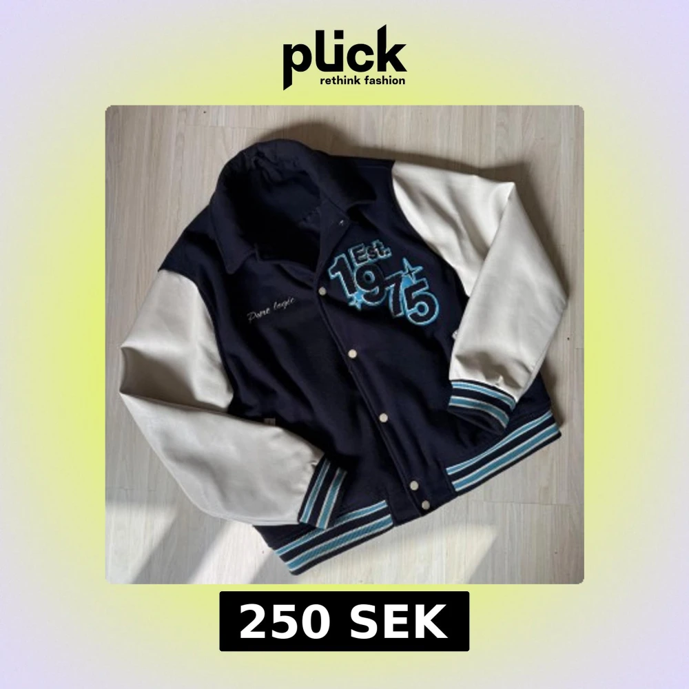 Snygg varsityjacka i marinblå med vita ärmar och broderade detaljer. Framsidan har texten 'Est. 1975' och 'Pure Logic', baksidan har stort broderi med 'PURE LOGIC' och en megafon. Jackan har knappar och randiga muddar.