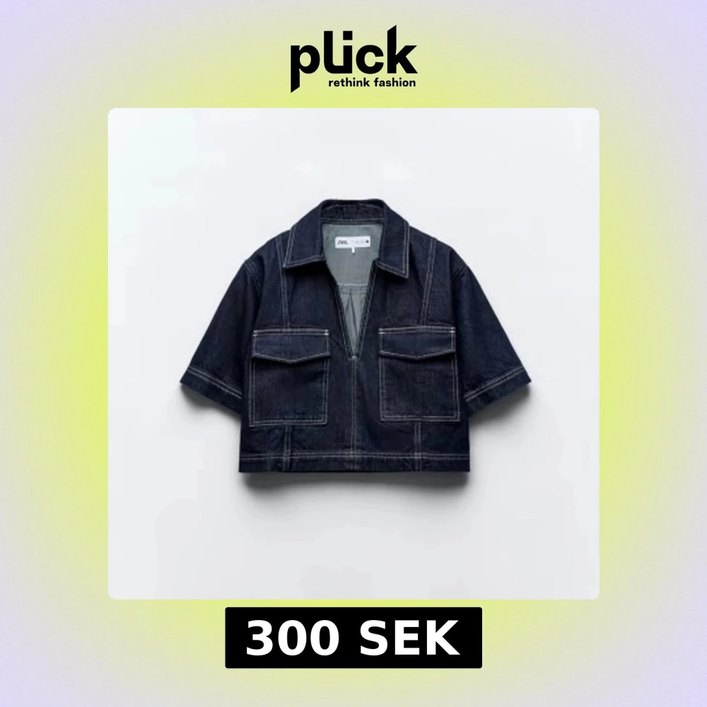 Snygg croppad jeansjacka från Zara i mörkblå denim med kontrastsömmar. Jackan har korta ärmar, två stora bröstfickor med lock och en halv dragkedja framtill. Perfekt för dig som vill ha en trendig och avslappnad look.