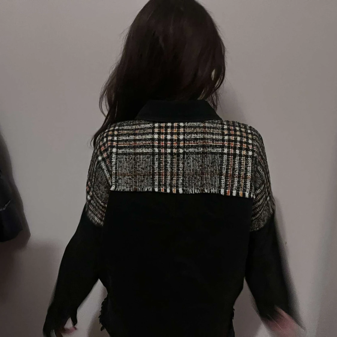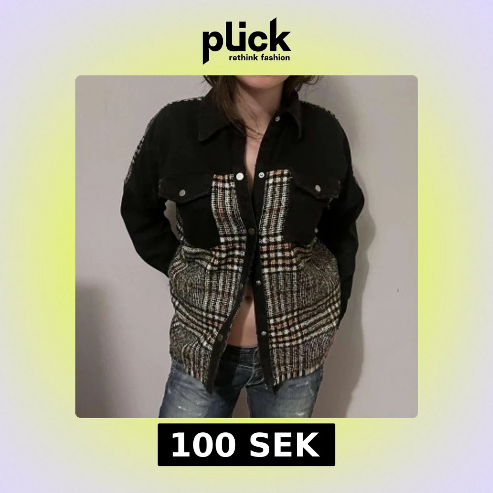 Snygg svart jacka med rutigt mönster i vitt, orange och beige. Jackan har långa ärmar och knappar framtill. Perfekt för en cool och avslappnad stil.