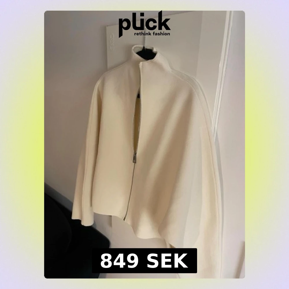 vit jacka i stickat material med hög krage och hel dragkedja framtill. Jackan har långärmad design och en clean, oversized passform. Helt ny med prislappen kvar.