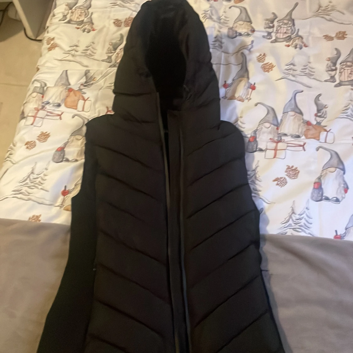 Snygg svart dunväst med dragkedja och huva. Perfekt för kyligare dagar och ger en stilren look. Västen har en quiltad design som ger extra värme och komfort.