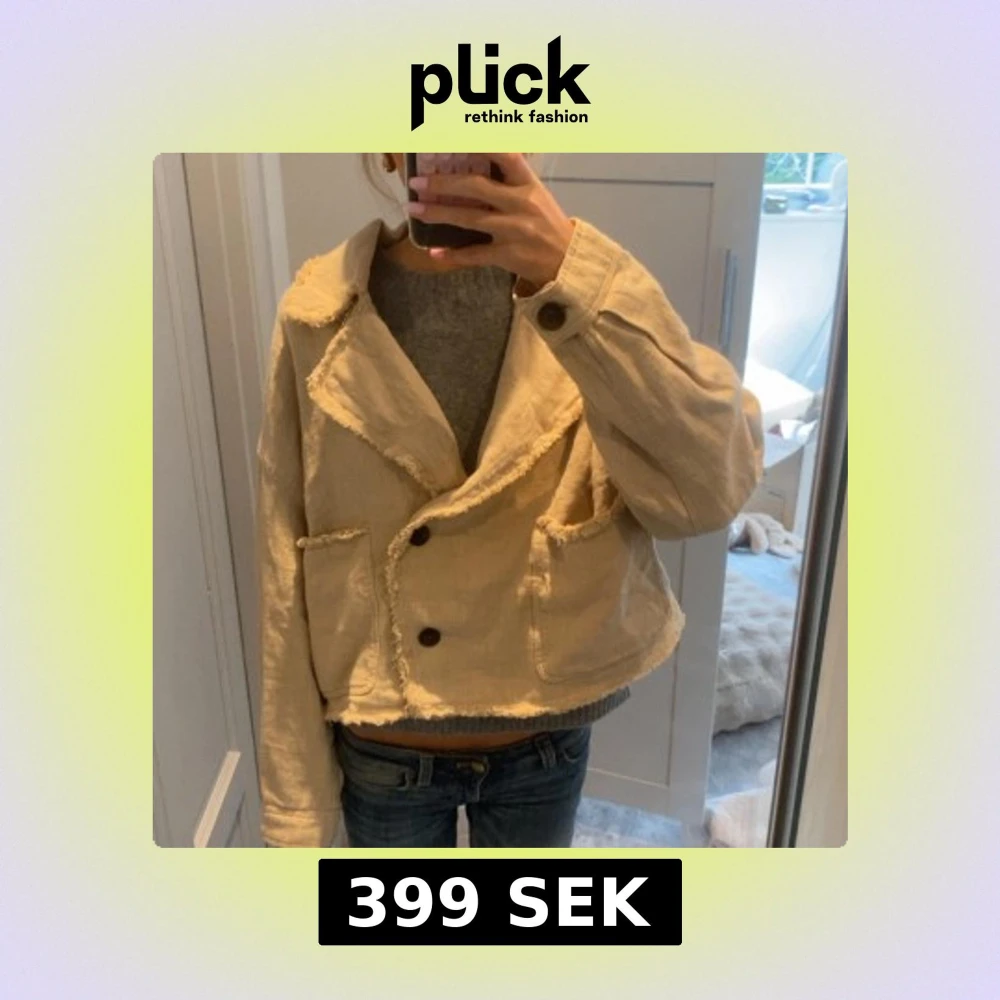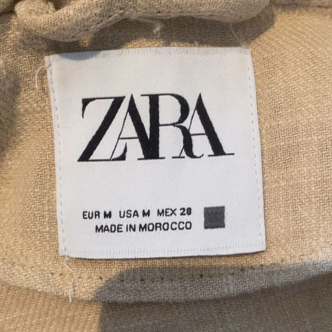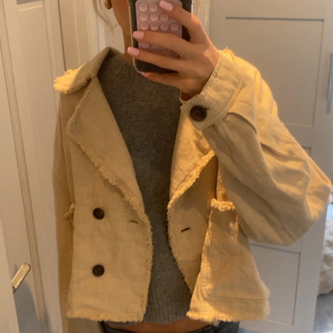 Säljer en beige croppad jacka från Zara med råa kanter och stora bruna knappar. Jackan har två fickor framtill, bred krage och är tillverkad i ett grovt bomullstyg. Perfekt för dig som gillar en chill och trendig look.
