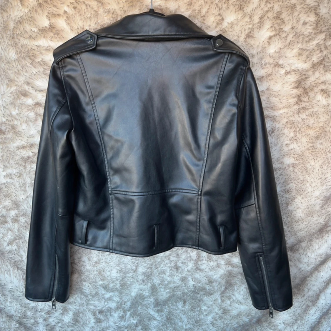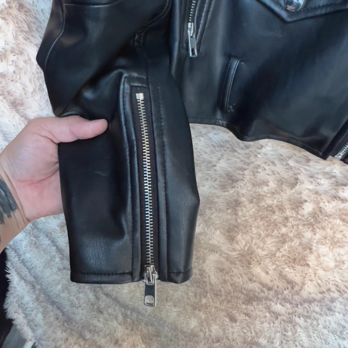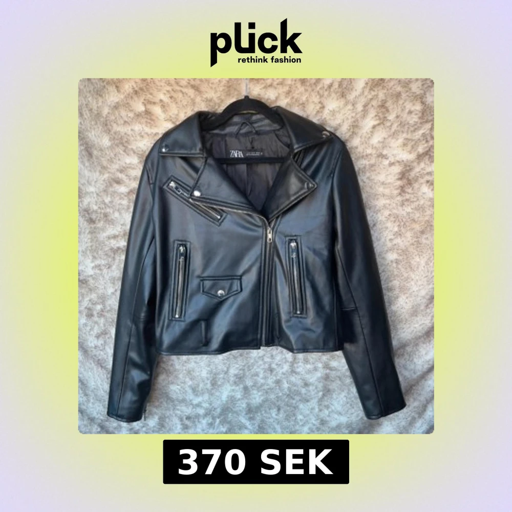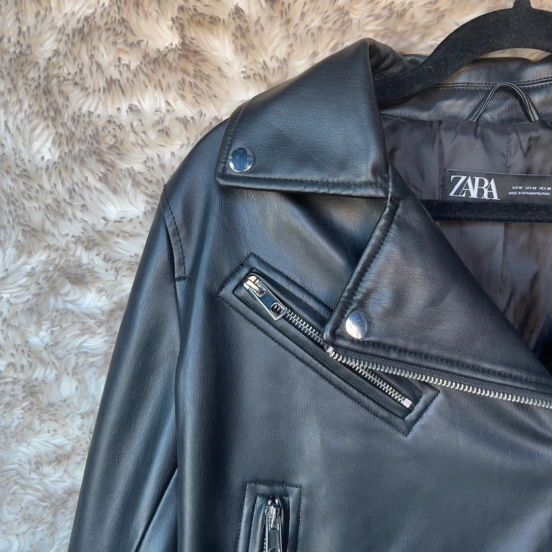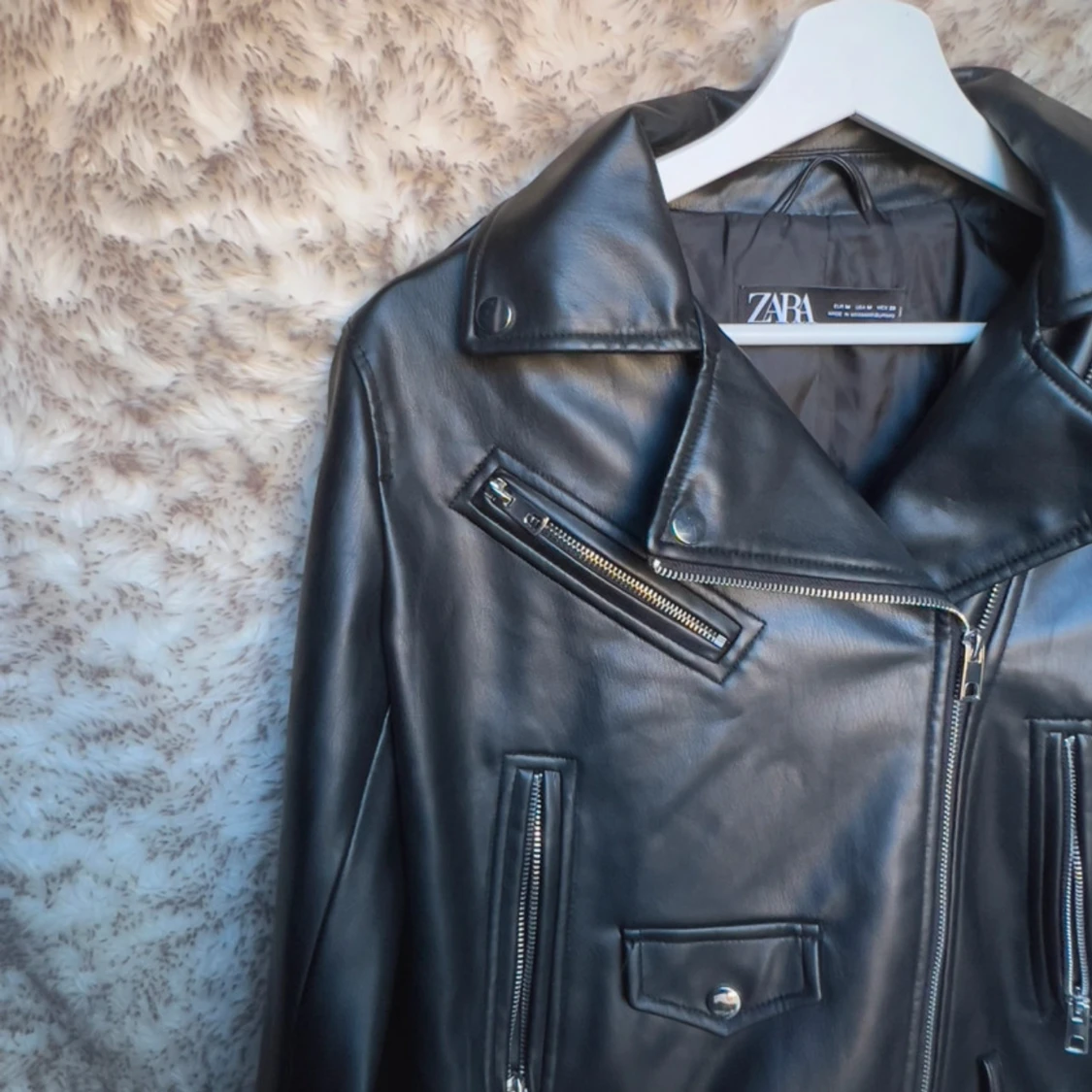 Snygg svart skinnjacka från Zara med klassisk bikerstil. Jackan har flera silvriga dragkedjor, bred krage med tryckknappar och detaljerade fickor.