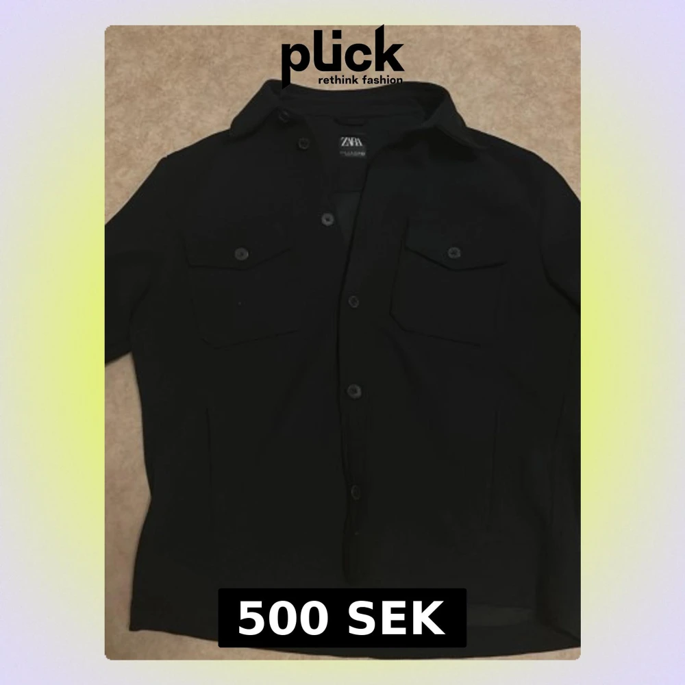 Stilren svart overshirt från Zara med klassisk krage och knäppning framtill. Två bröstfickor med lock och knappar ger en clean look. Perfekt att bära öppen eller stängd över en t-shirt för en avslappnad vibe. Aldrig använd. Säljer eftersom beställde för liten storlek