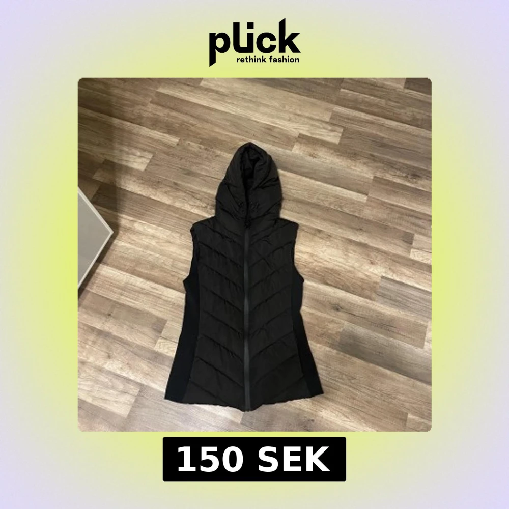 Snygg svart dunväst från Zara i storlek S. Västen har en quiltad design med dragkedja framtill och en stor huva med snörning. Perfekt för lager-på-lager och har en stilren, lite längre passform som ger en cool look.