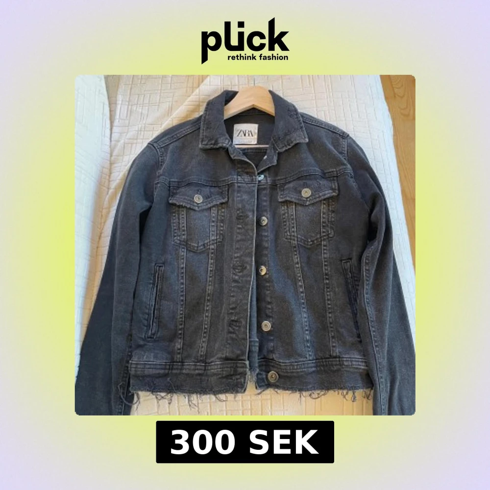 Säljer en svart jeansjacka från Zara med snygga slitningar och rå kant nedtill. Jackan har klassisk krage, två bröstfickor med knappar och långa ärmar. Perfekt för dig som gillar en cool och avslappnad stil.