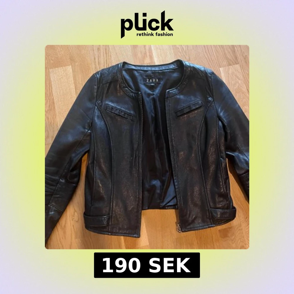 Snygg svart vintage skinnjacka från Zara med rundad krage och dragkedja framtill. Jackan har dekorativa sömmar, spännen i midjan och långa ärmar. Perfekt för dig som vill ha en stilren och edgy look. Står storlek M men passar mer XS och S!! I jättebra skick!