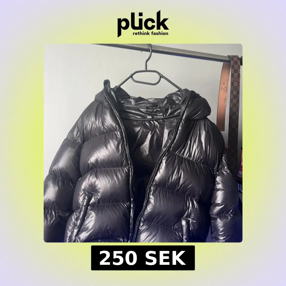 Säljer en svart pufferjacka från Zara i storlek S. Jackan har en glansig finish, huva och dragkedja framtill. Perfekt för kalla dagar när du vill hålla stilen och samtidigt vara varm. Jackan har en oversized vibe och är riktigt mjuk och skön.
