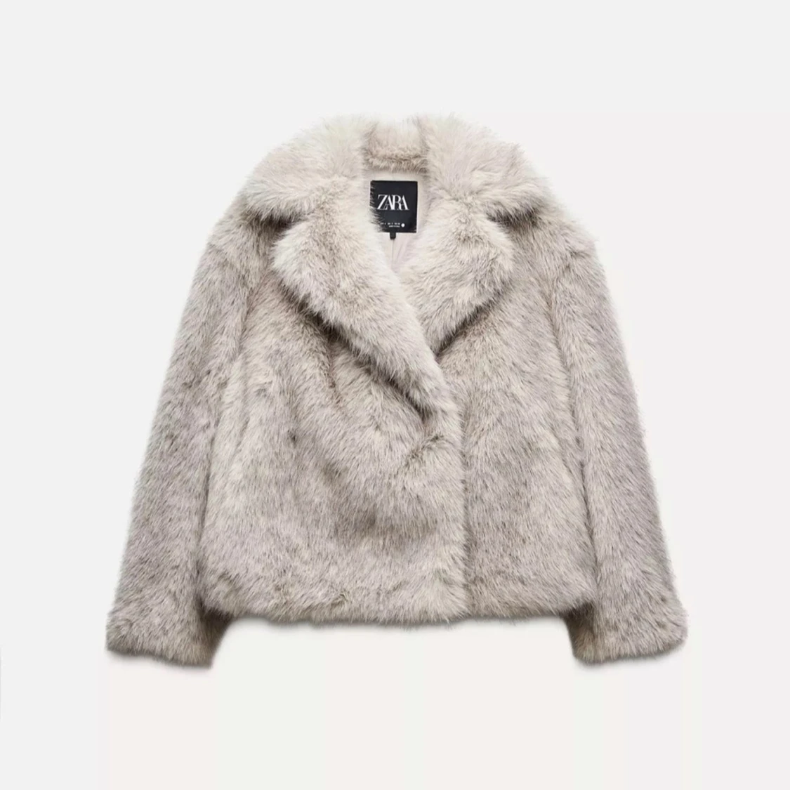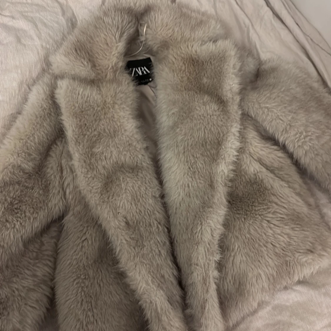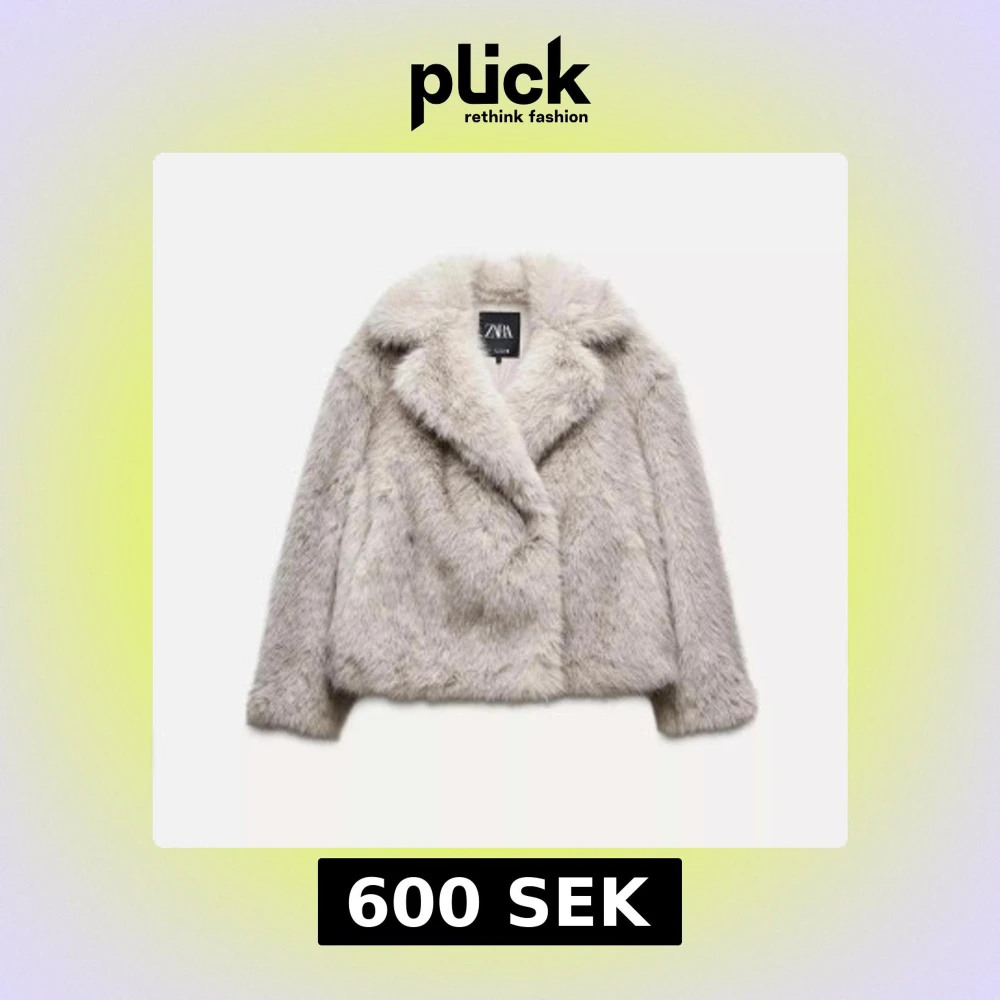 Snygg och fluffig beige pälsjacka från Zara med bred krage och lång ärm. Jackan har en klassisk, lite boxig passform och är tillverkad i mjukt fuskpälsmaterial som ger en lyxig känsla. Perfekt för dig som vill sticka ut med en trendig look.