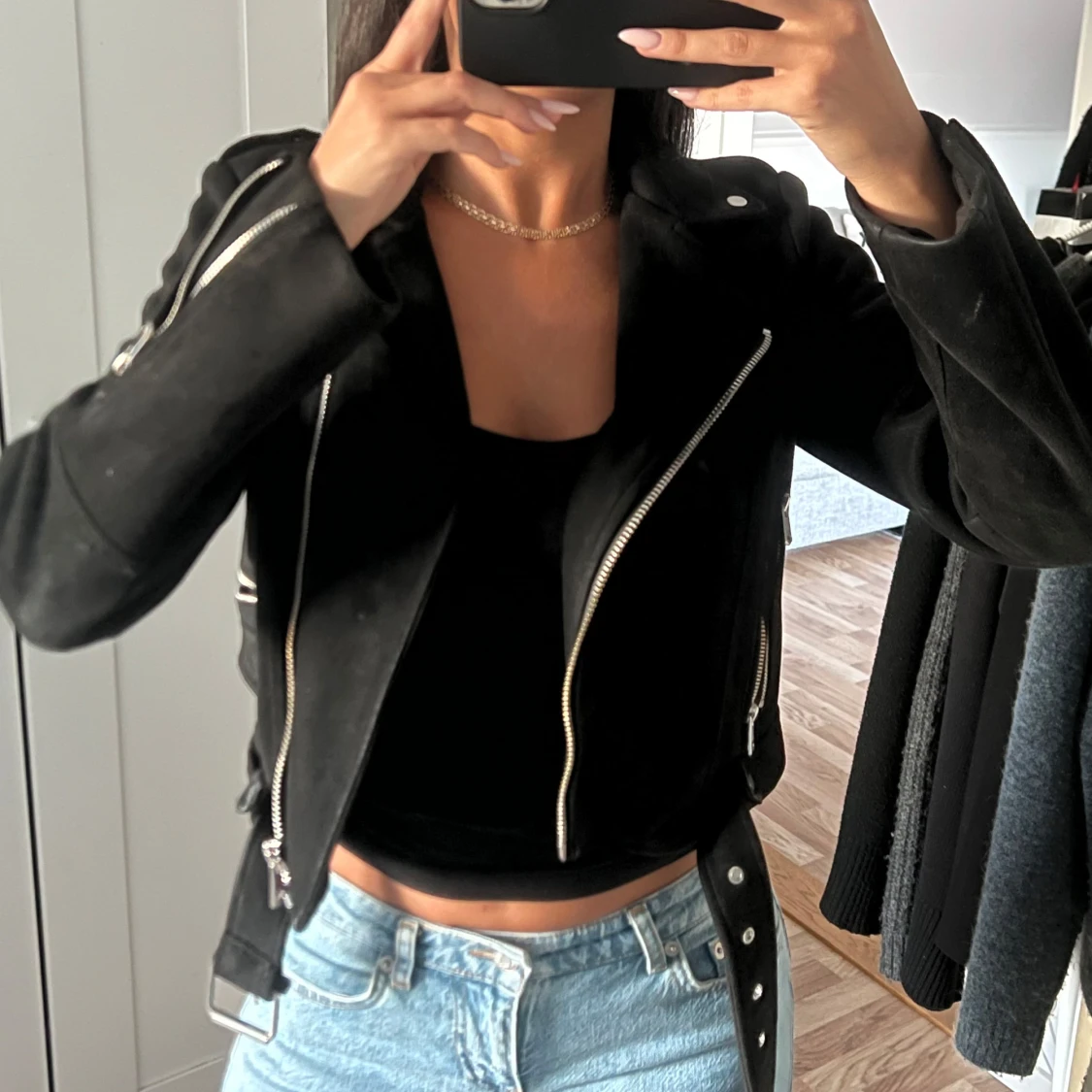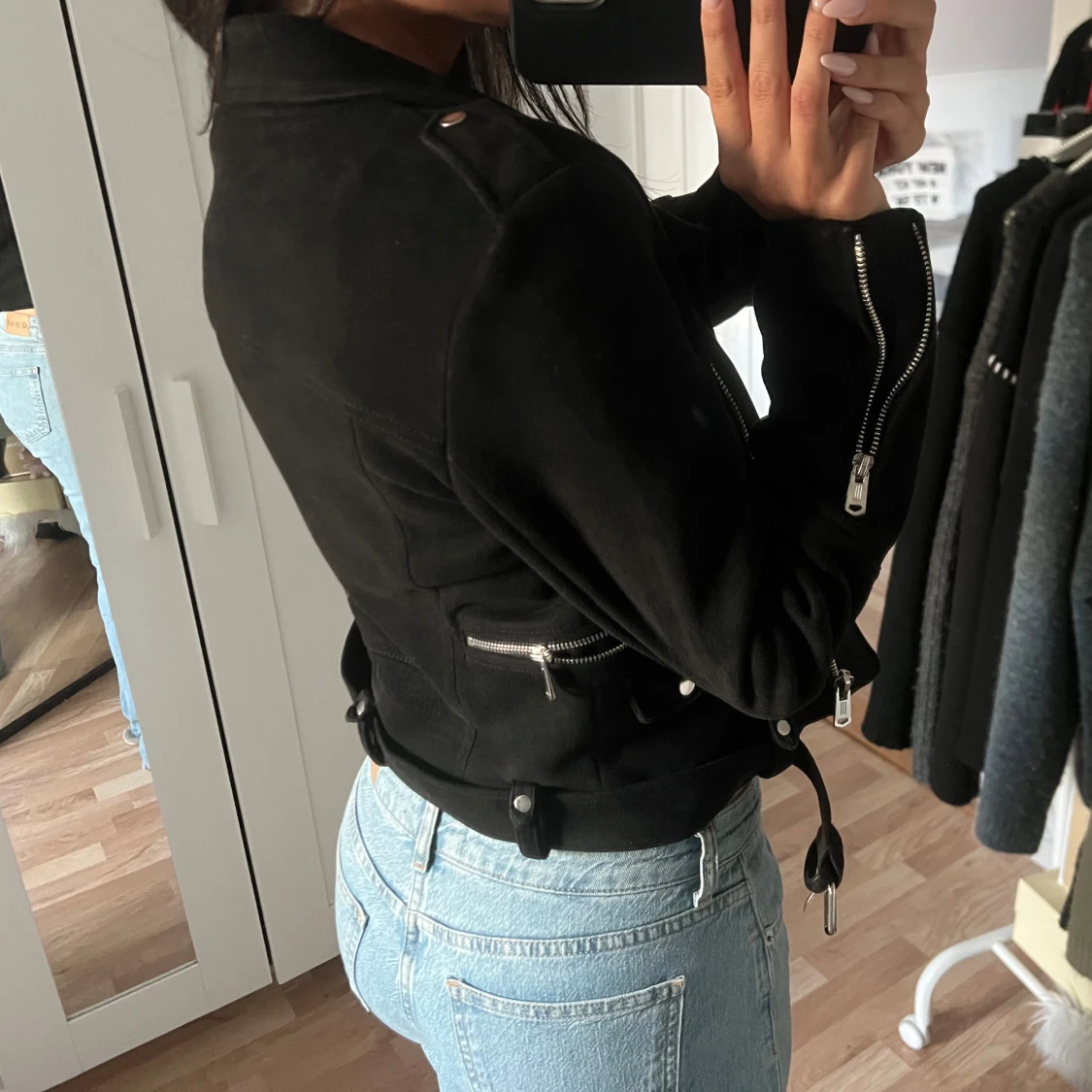 Snygg svart bikerjacka i mocka med silvriga dragkedjor och bälte i midjan. Jackan är köpt på Zara, används ett fåtal gånger, kommer i mycket bra skick.