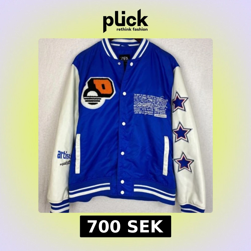Säljer en cool blå och vit bomberjacka från Zara med broderade stjärnor på ärmarna och patchar på bröstet. Jackan har knappar framtill och ribbade muddar vid ärmslut och nederkant. Perfekt nu inför våren. Det är storlek S från män avdelningen men passar både tjejer och killar! Köpt för lite mer än 1000kr och använd Max 3 gånger🥰 hör av er vid frågor!