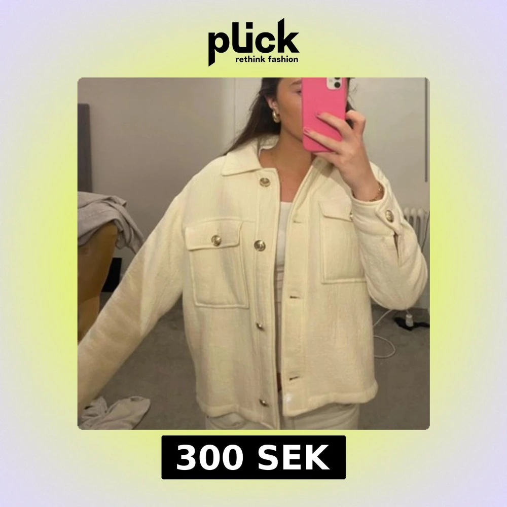 Säljer en oversized vit overshirt med stora bröstfickor och guldfärgade knappar. Jackan har klassisk krage och lång ärm med knapp vid mudden. Materialet är mjukt och har en lätt struktur som ger en chill vibe. Perfekt att slänga över en t-shirt för en clean look.