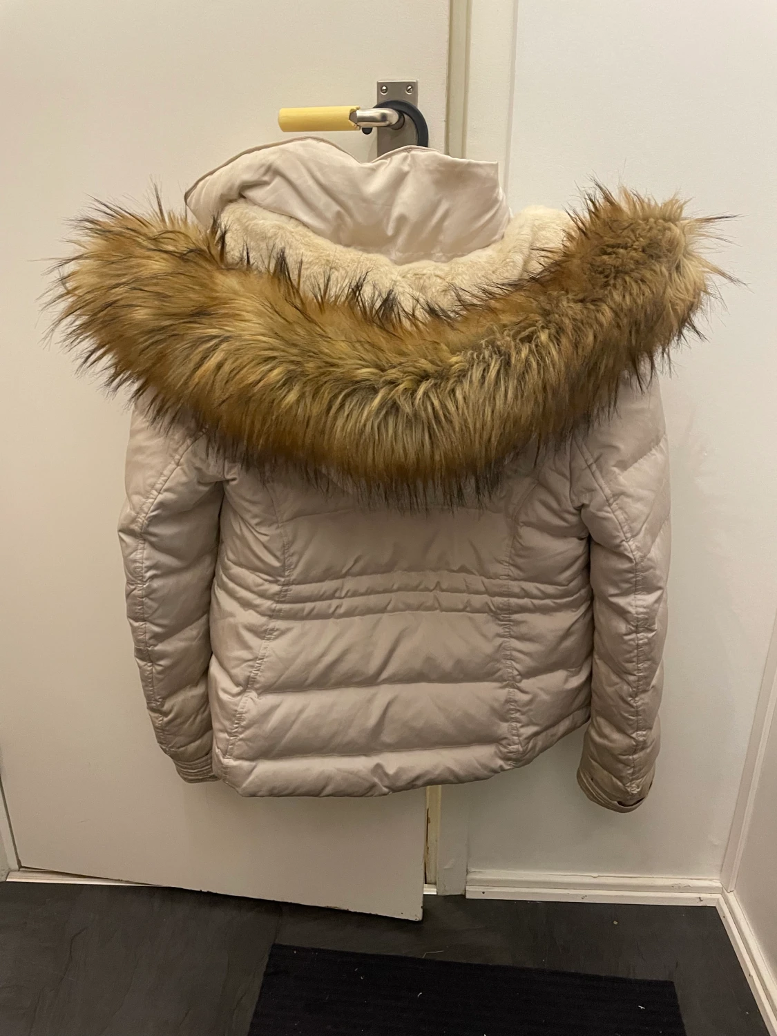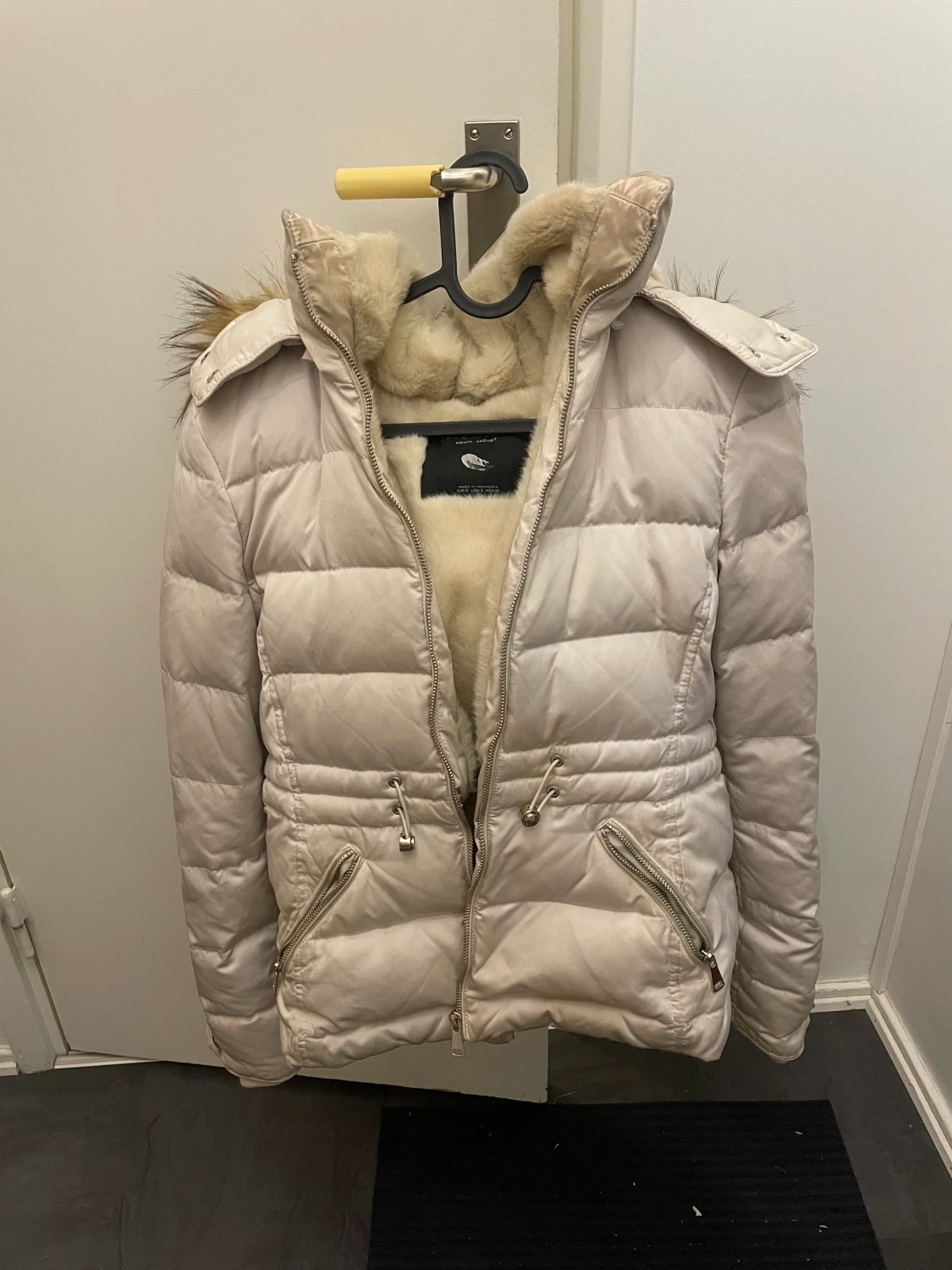 Säljer min vita vinterjacka i storlek S. Den är varm, har en stor luva och även spännen man kan dra åt i midjan om man vill ha en bättre passform. Kan skickas med posten eller hämtas upp i Kungsbacka, ev Lindome.