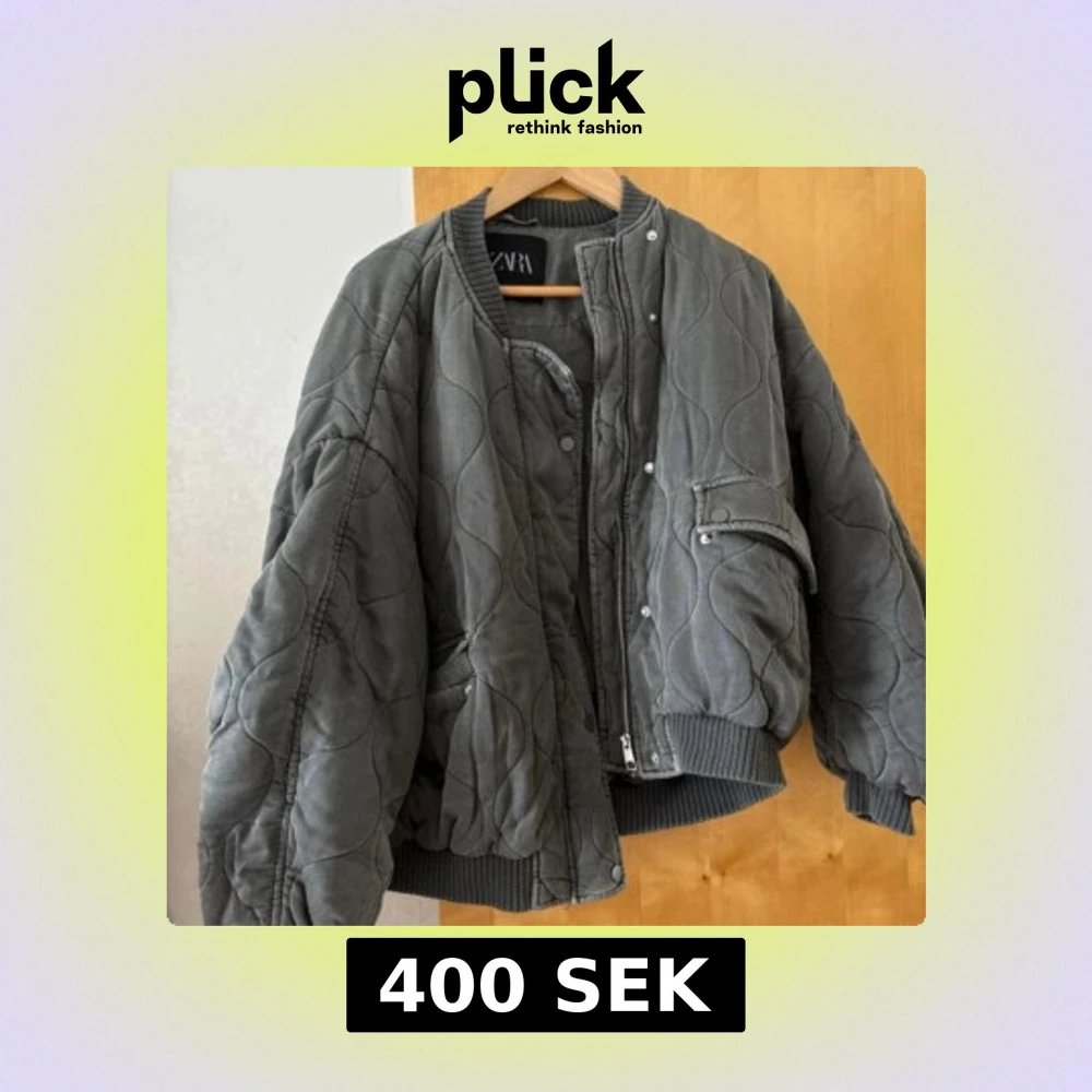 Säljer en oversized bomberjacka från Zara i mörkgrått. Jackan har ribbade muddar, dragkedja och tryckknappar framtill samt fickor.