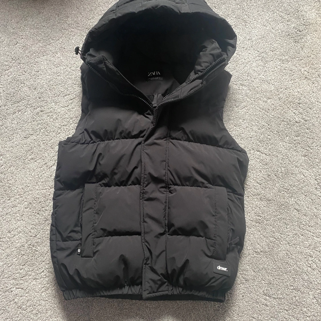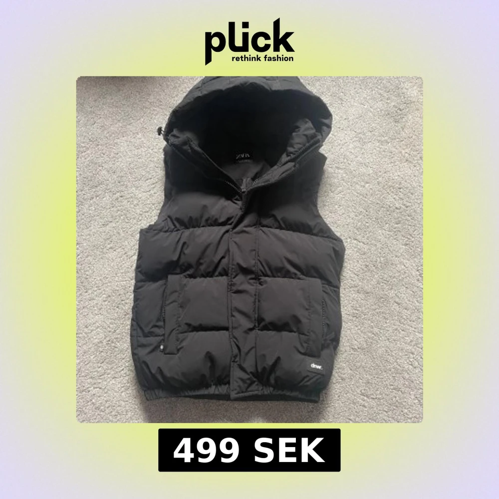 Säljer en svart dunväst från Zara. Västen har en stor huva, två rejäla fickor framtill och dragkedja. Perfekt för lager-på-lager och funkar till både chill och utehäng. Enkel och stilren design som passar till det mesta.