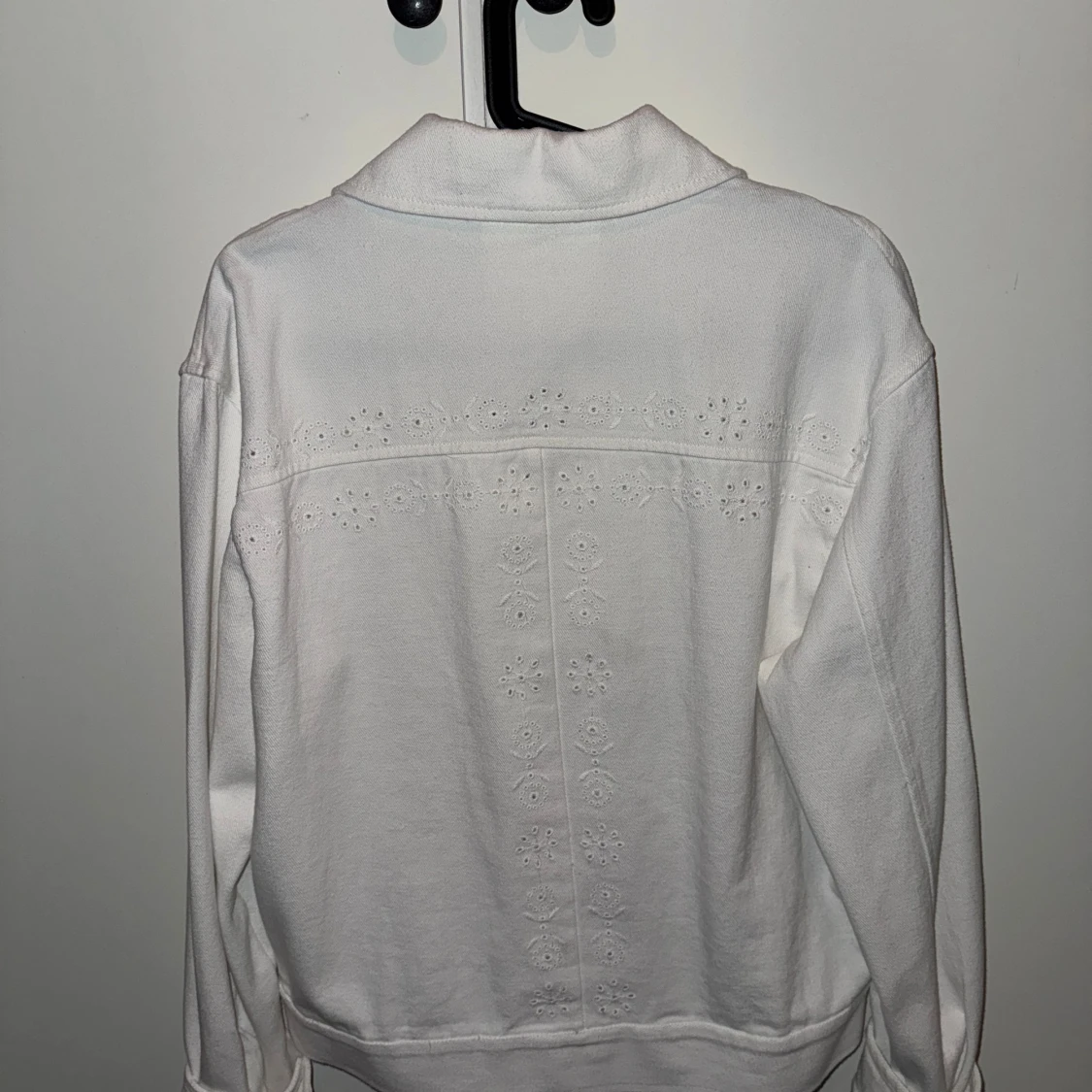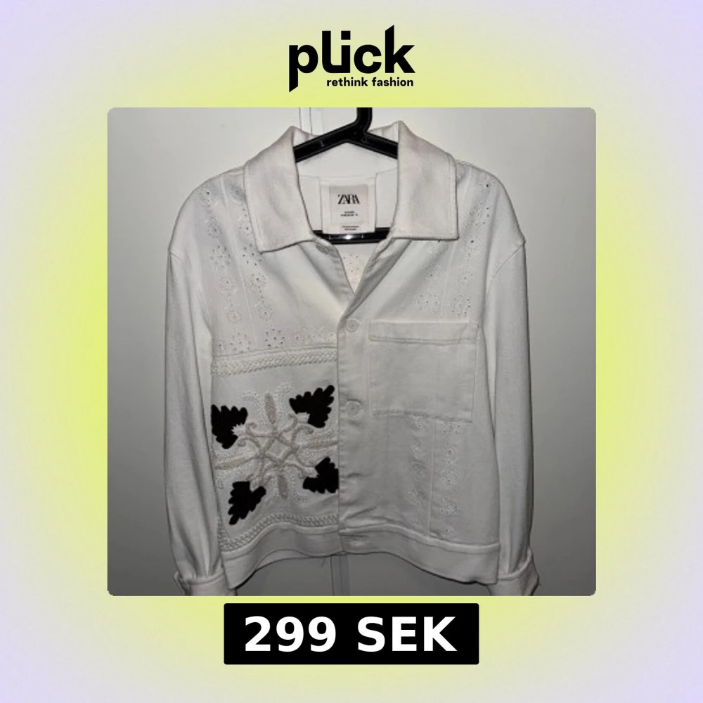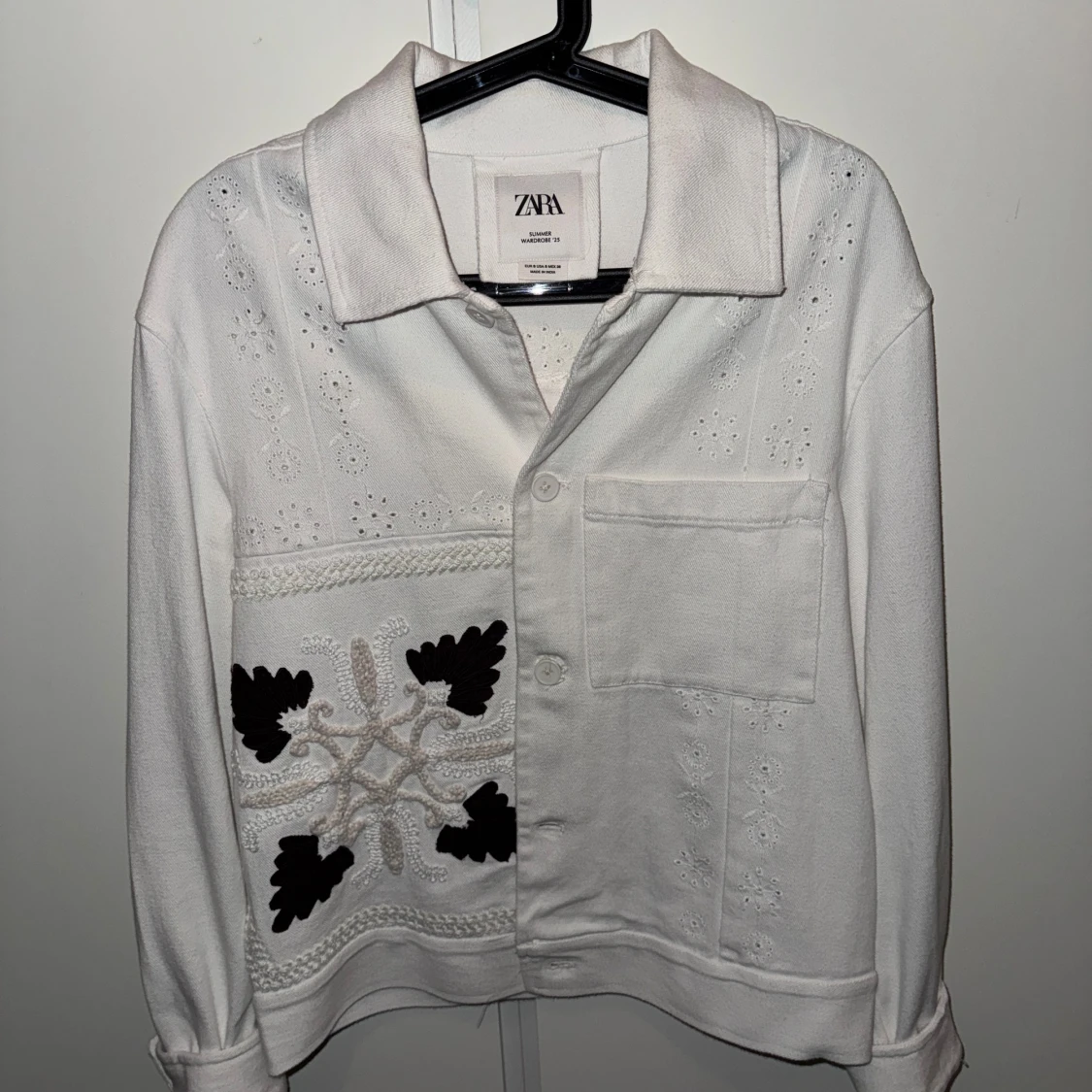 Säljer en vit overshirt från Zara med broderade detaljer och svart brodyr framtill. Jackan har en bröstficka, knäppning framtill och krage. Materialet är bomull och plagget har lång ärm. Perfekt för dig som gillar unika detaljer och stilren look.