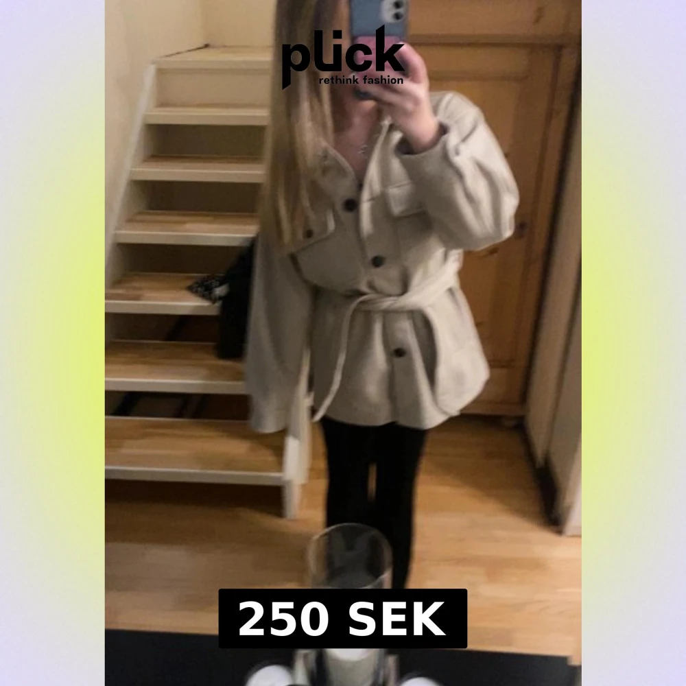 Snygg beige overshirt kappa från Zara med stora svarta knappar, två bröstfickor och bälte i midjan. Jackan har en loose fit och är perfekt att slänga på sig över en hoodie eller t-shirt. Materialet är mjukt och känns riktigt skönt mot huden.