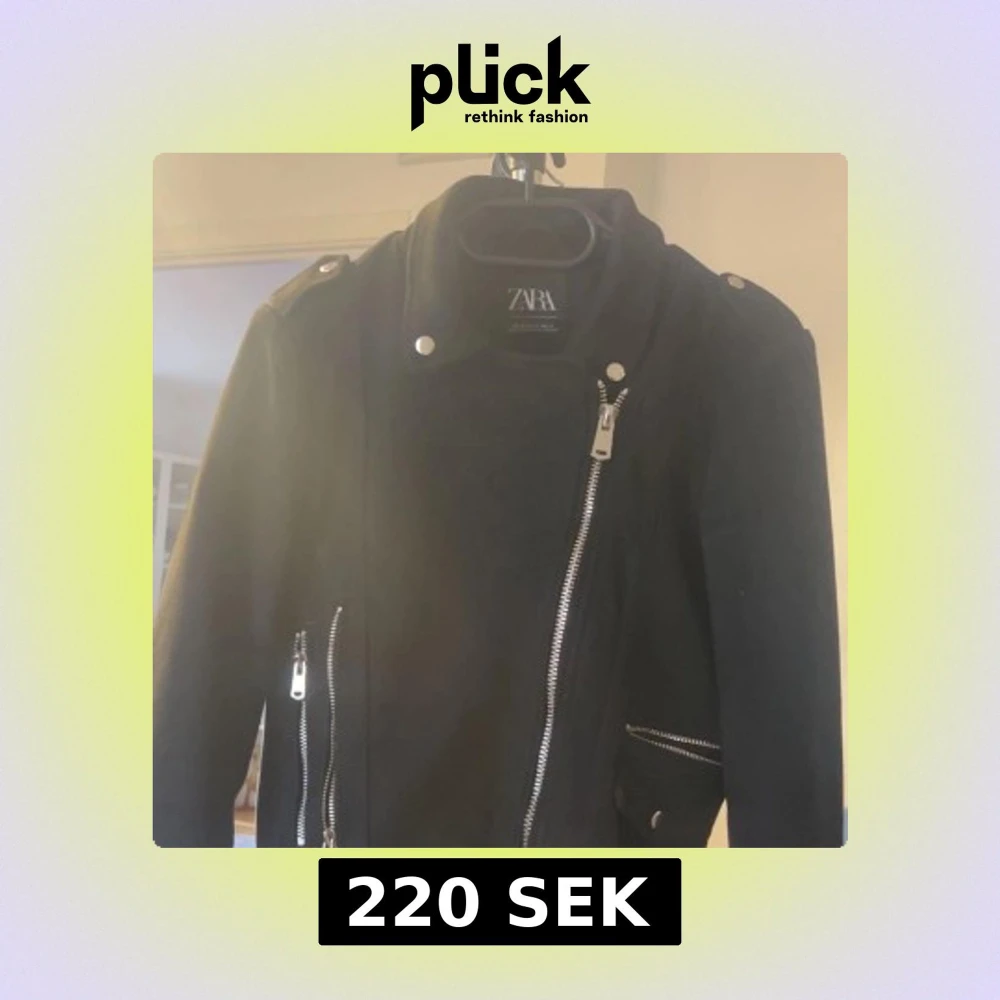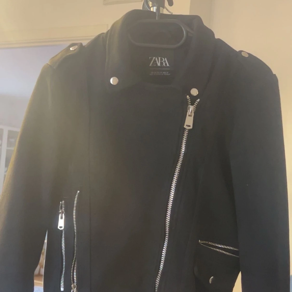 Snygg svart skinnjacka från Zara med silvriga dragkedjor och knappar. Jackan har klassisk bikerstil med sned dragkedja, axelklaffar och flera fickor med dragkedja. Perfekt för dig som vill ha en edgy look.