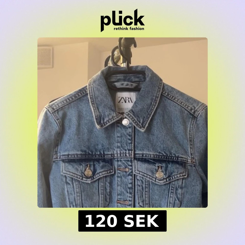 Snygg klassisk blå jeansjacka från Zara med krage och silverfärgade knappar framtill. Jackan har två bröstfickor med lock och knapp, samt markerade sömmar för en cool look. Perfekt att slänga över en hoodie eller t-shirt.