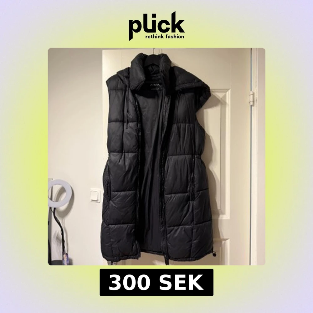 Snygg svart dunväst från Zara med dragkedja och hög krage. Perfekt för kyliga dagar och ger en stilren look. Västen har en quiltad design och är ärmlös, vilket gör den lätt att bära över en tröja eller hoodie.