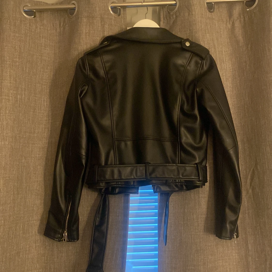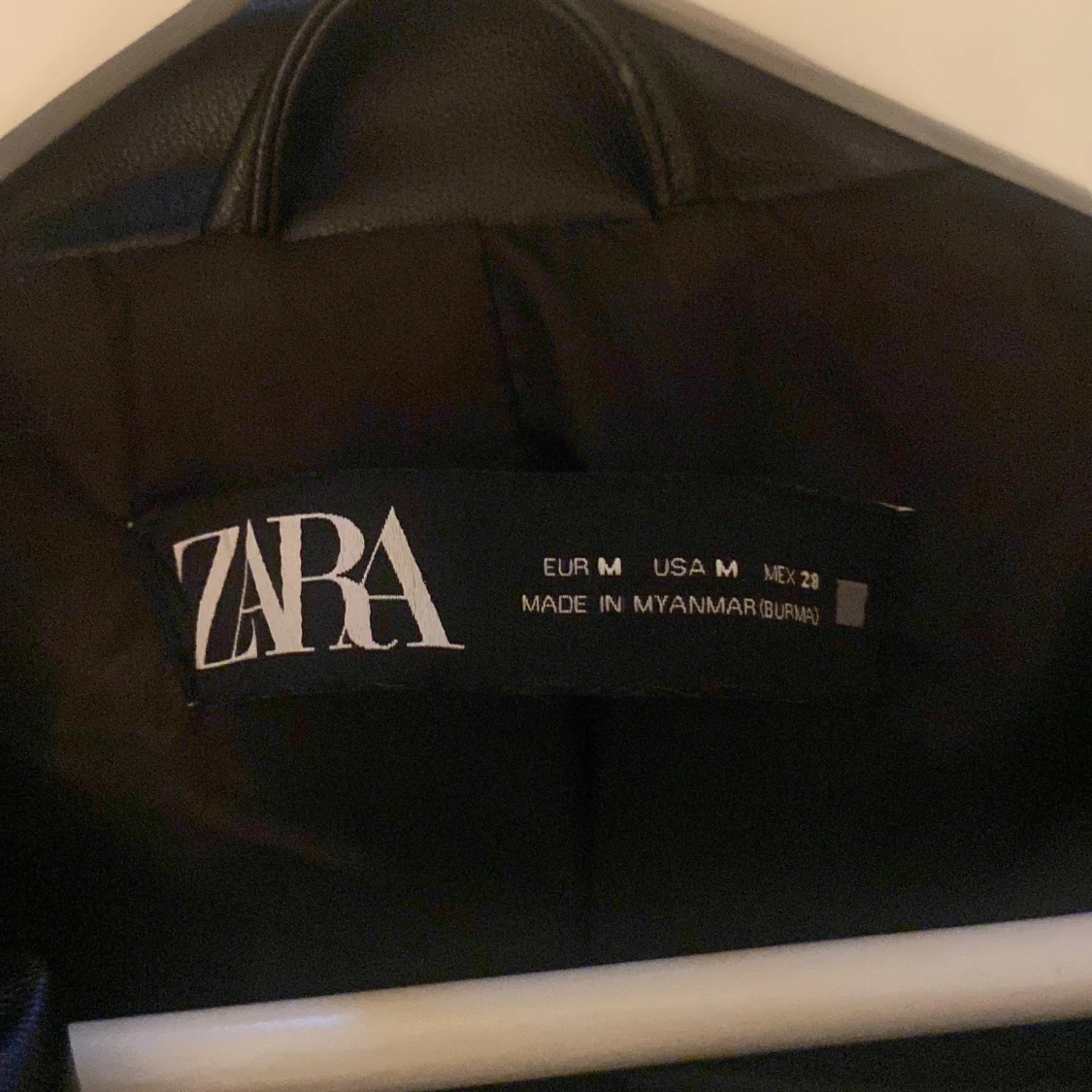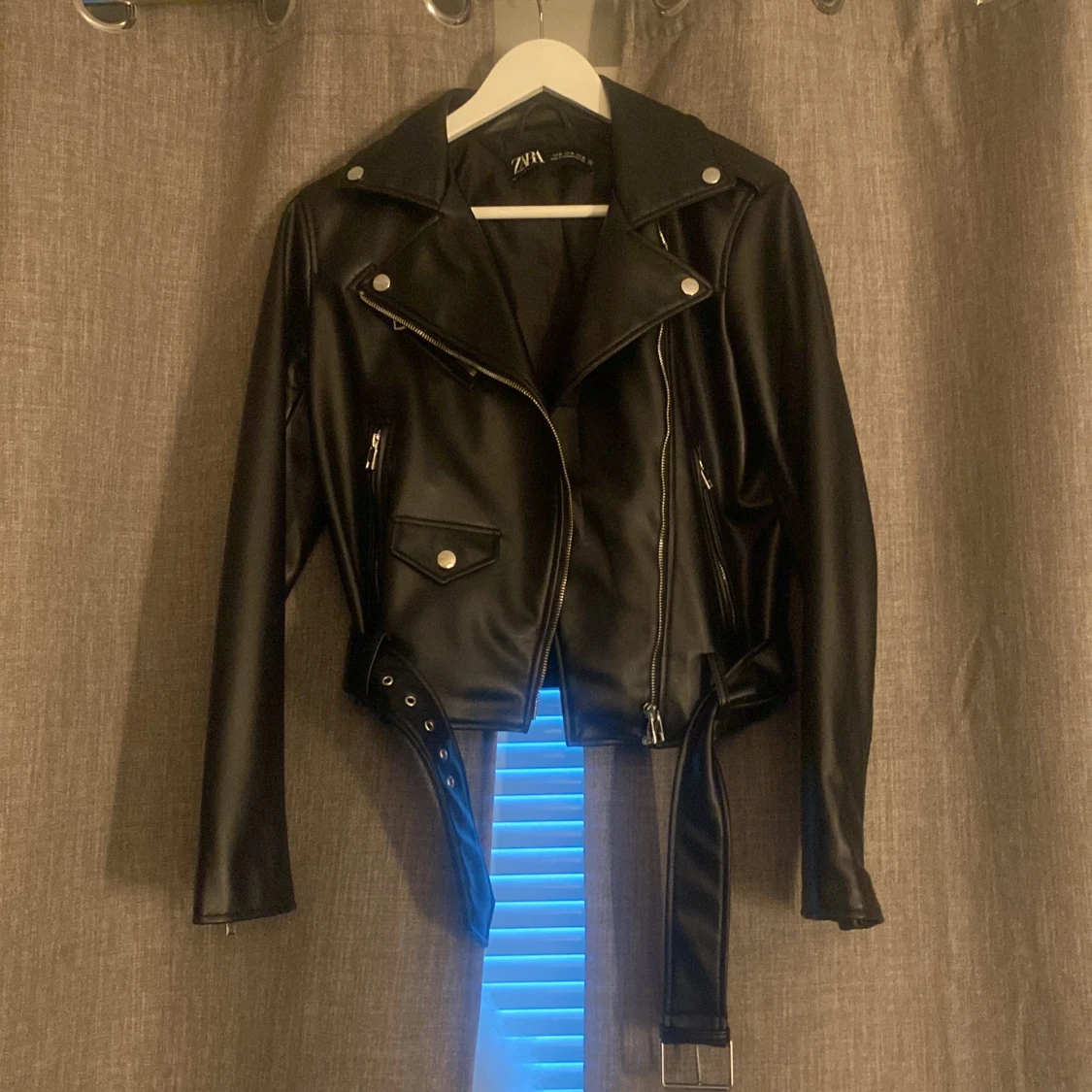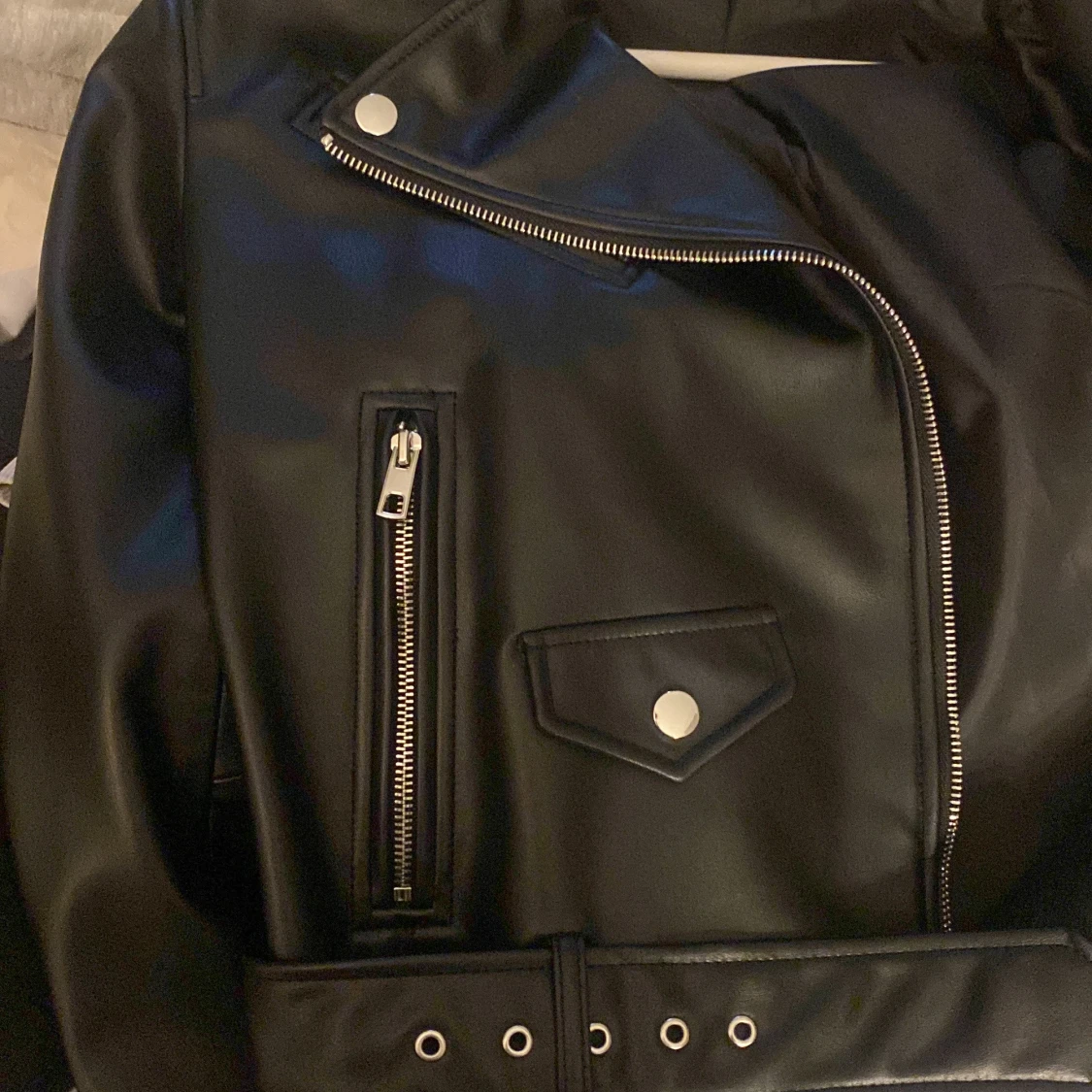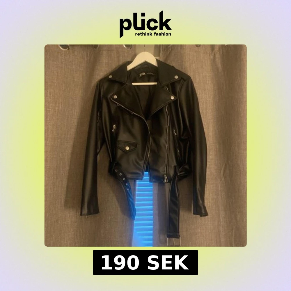 En skinnjacka från Zara! Aldrig använd. Jätte bra skick inga fläckar. Storlek M men passar även mig som har Xs/S. Finns främre ficka