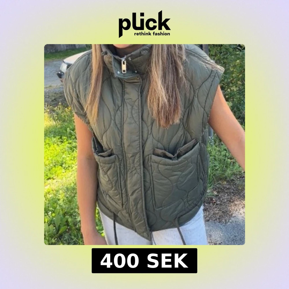 Snygg olivgrön dunväst med quiltad design, hög krage och dragkedja framtill. Västen har två stora fickor och dragsko i nederkant för extra passform. Perfekt att slänga över en hoodie eller tröja för en cool lager-på-lager-look.