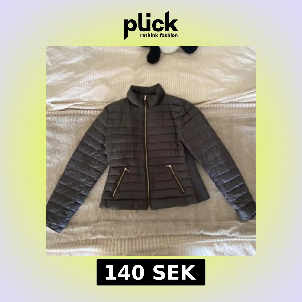 Svart pufferjacka från Zara med quiltad design och guldiga dragkedjor. Jackan har hög krage, två snedställda fickor med dragkedja och snygga detaljer baktill. Perfekt för kyliga dagar och enkel att matcha med allt.