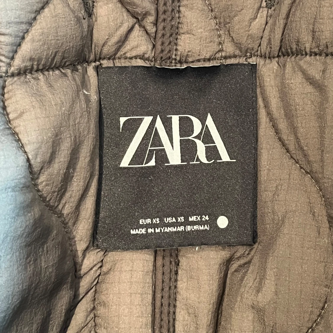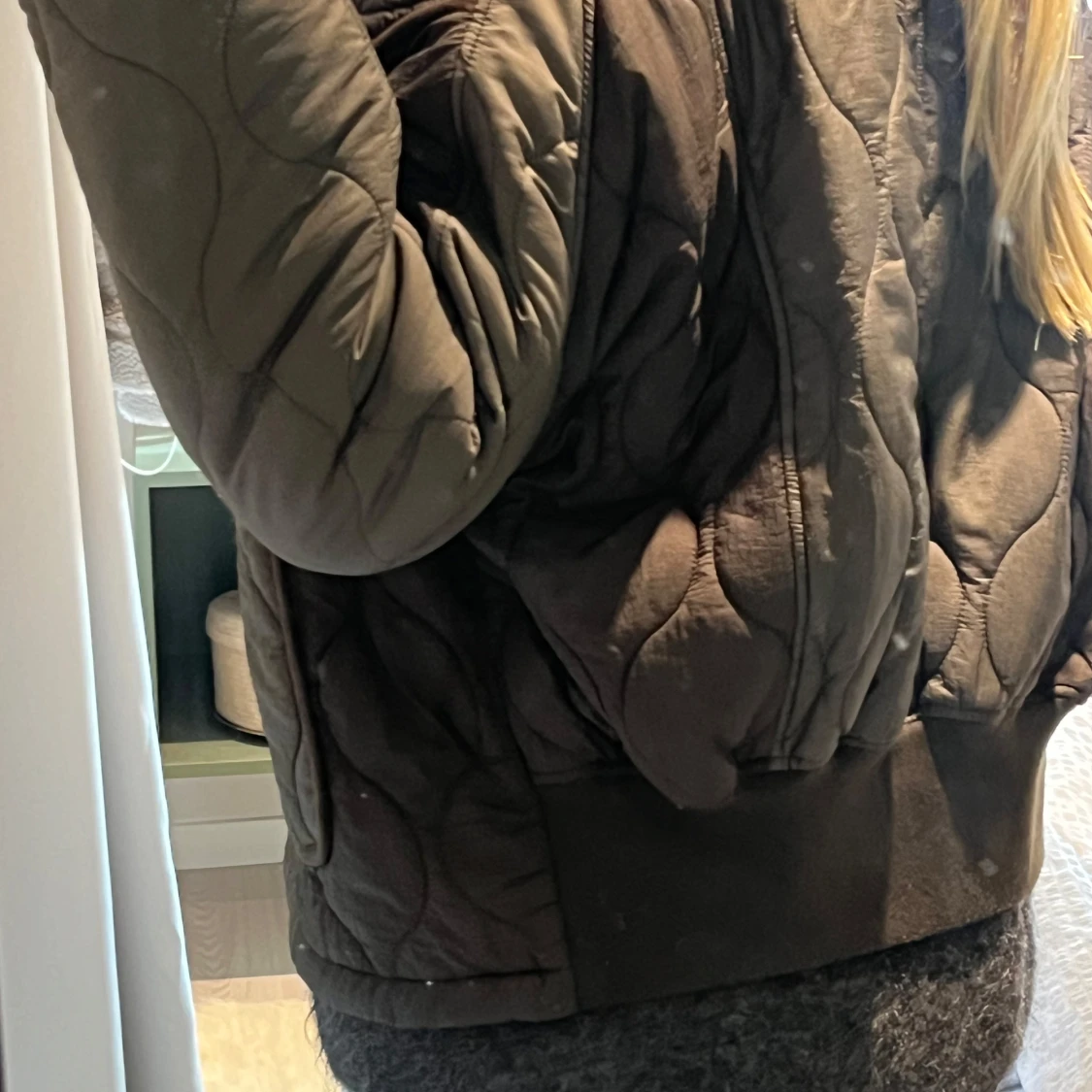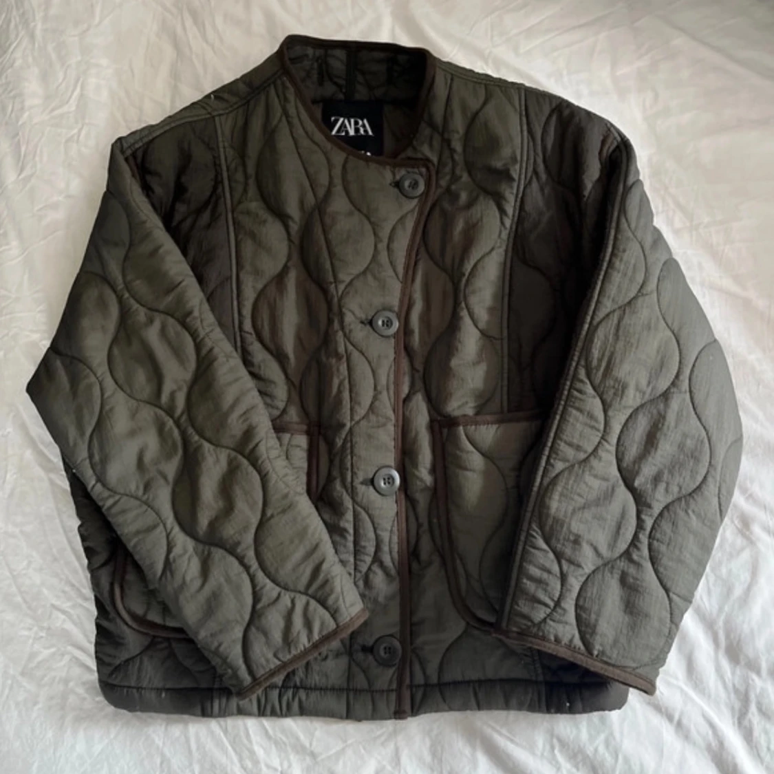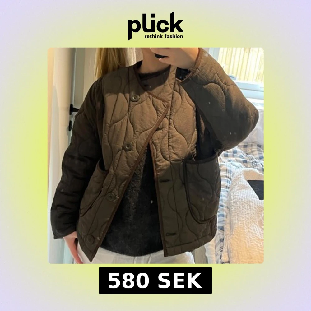 Säljer en olivgrön quiltad jacka från Zara med knappar framtill. Jackan har en rund halsringning och stora fickor på sidorna. Resår i ryggen. Passar XS/S beroende på hur du vill att den ska sitta!