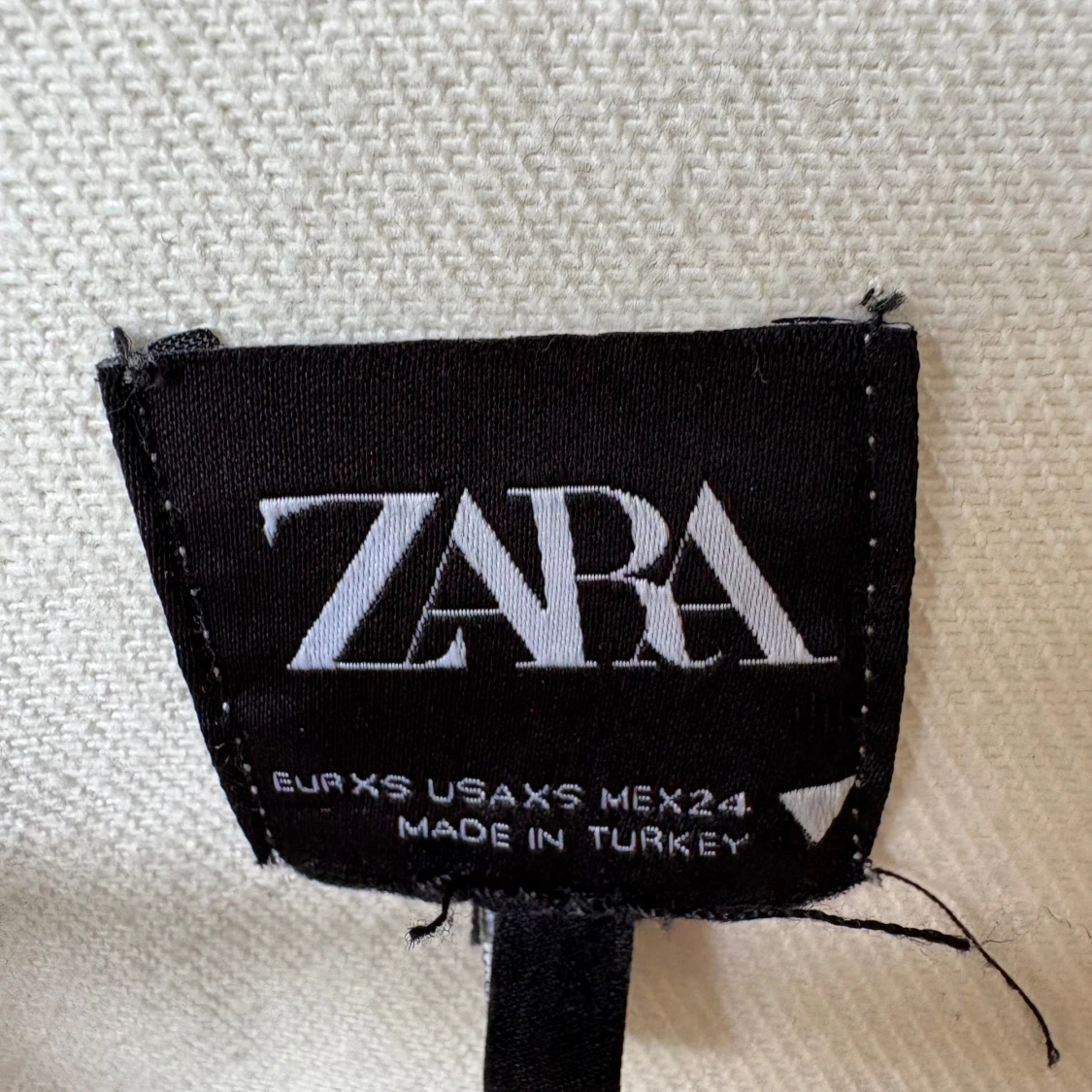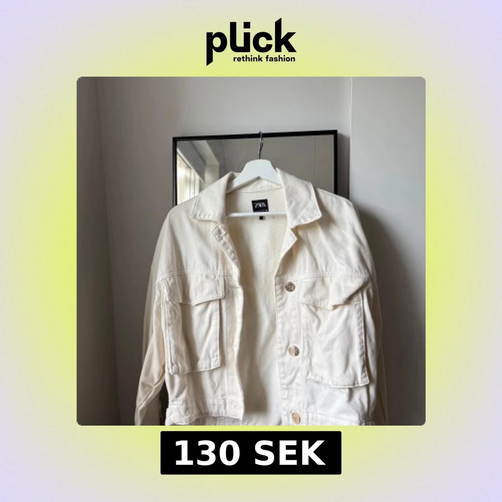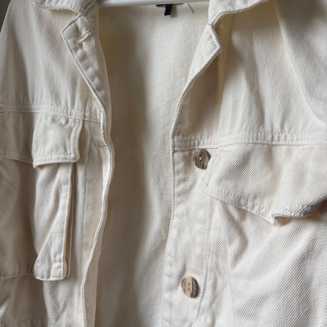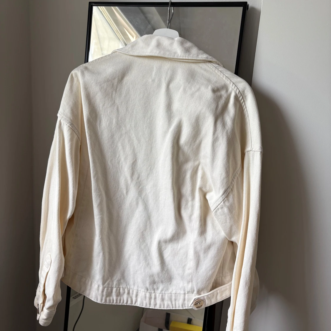Snygg beige jeansjacka från Zara i storlek XS( passar för mig som har M) Jackan har klassisk krage, stora bröstfickor med lock och knappar framtill. Bra skick!