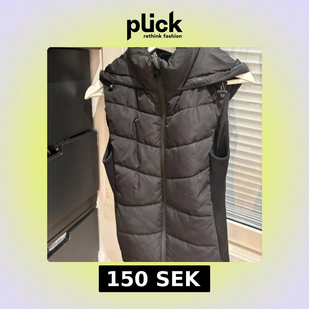 Snygg svart dunväst med dragkedja och huva från Zara. Perfekt för kyliga dagar när du vill hålla värmen utan att kompromissa med stilen.