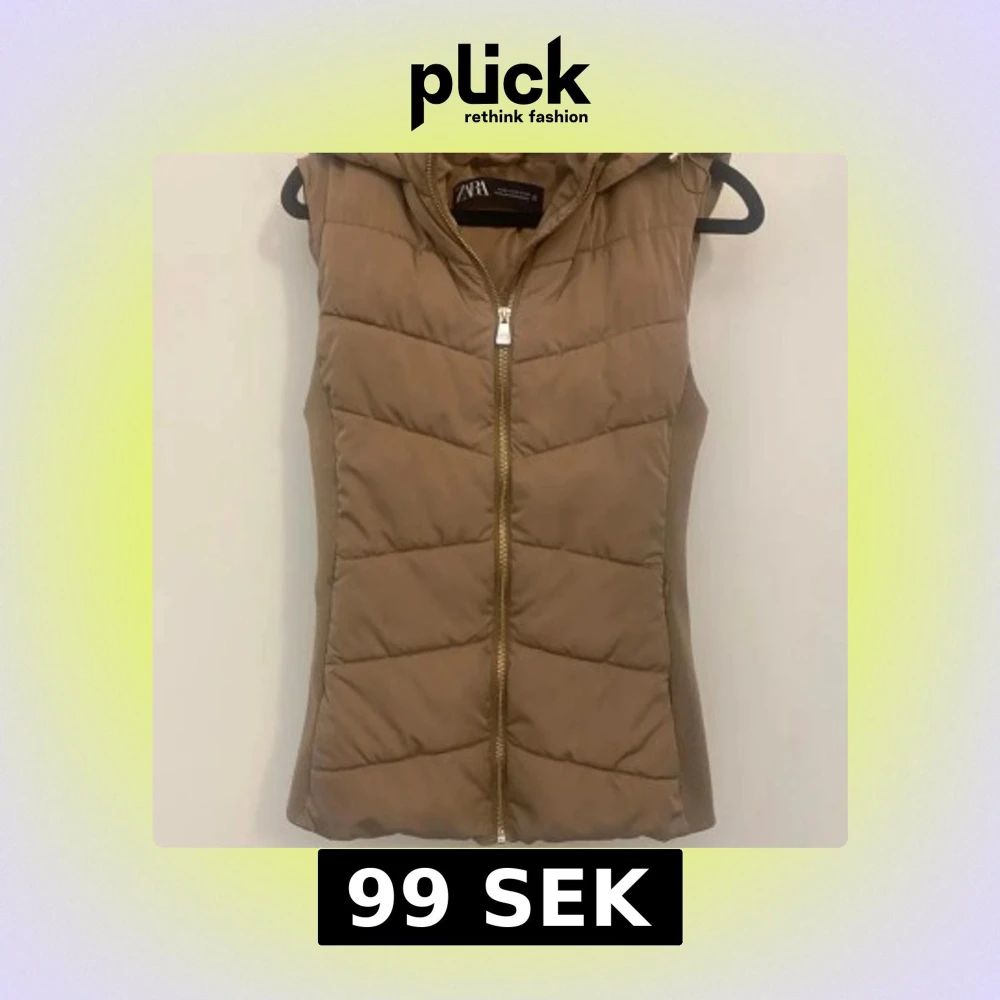 Snygg beige dunväst från Zara med dragkedja och huva. Perfekt för kyliga dagar när du vill hålla dig varm och stilren. Säljer min bruna väst från zara på grund av få användning. Ett hänge på ena fickan har lossnat men det syns nästan inte eftersom den är så pass liten och fickan funkar ändå. Köparen står för frakten