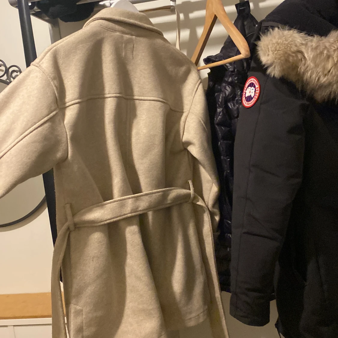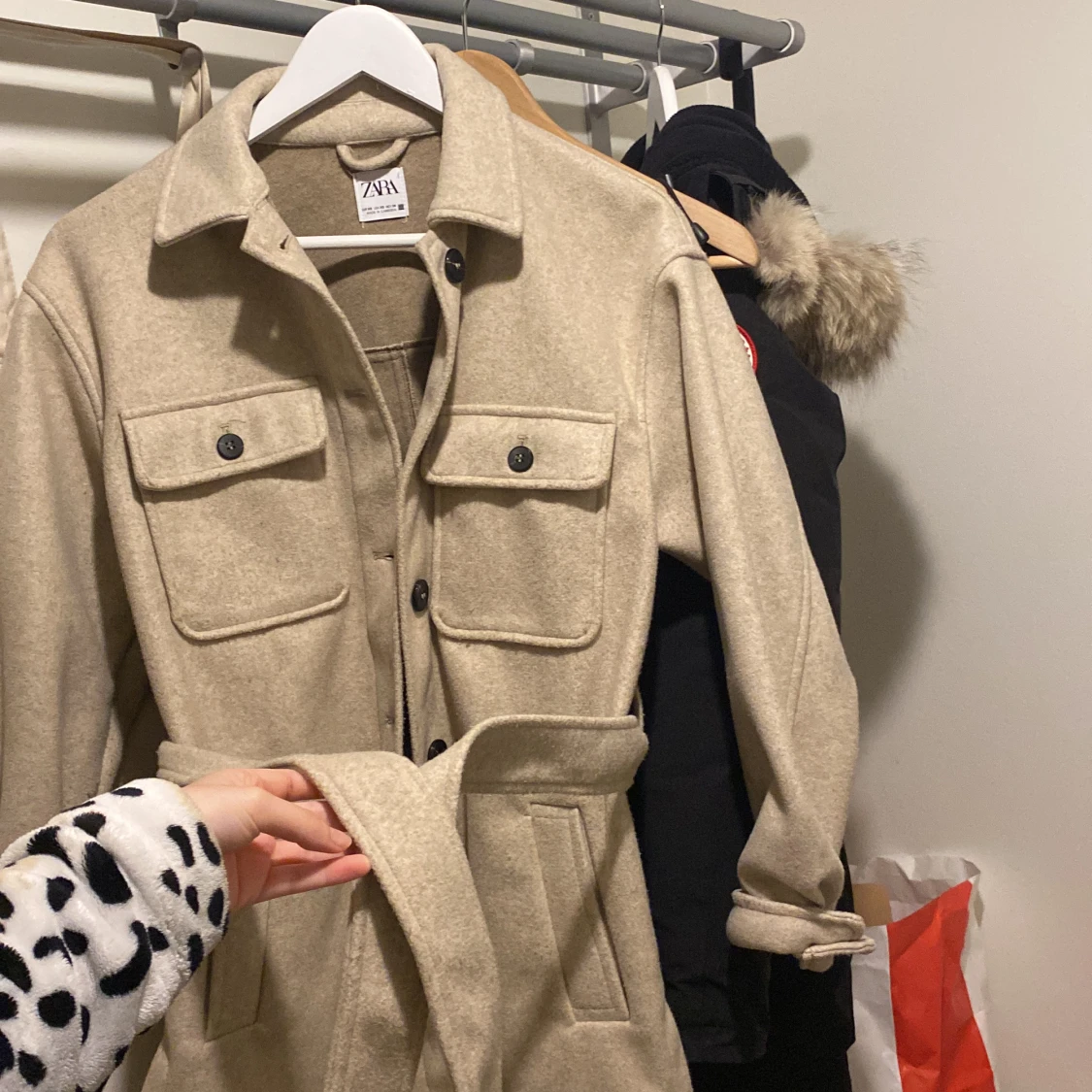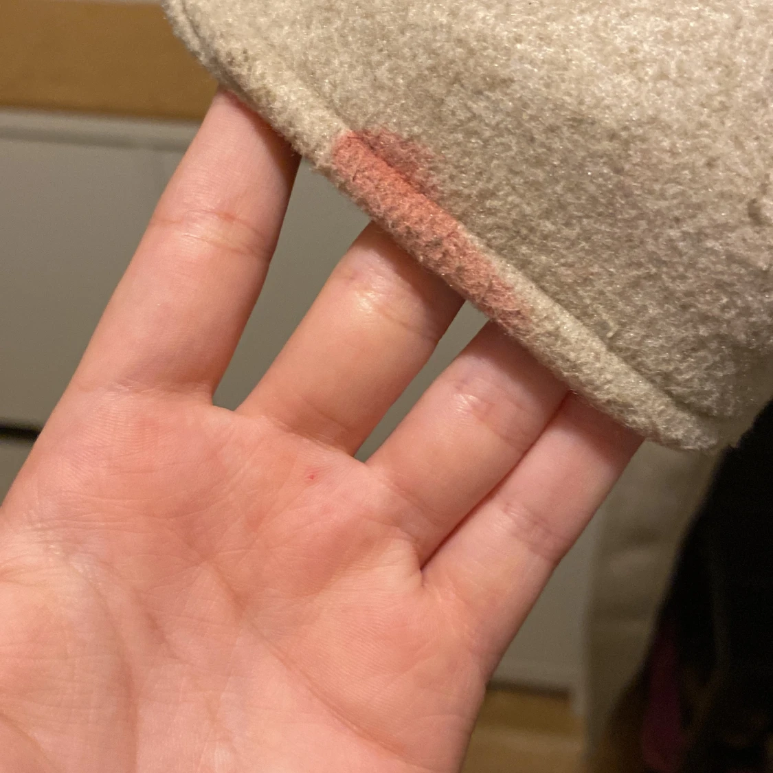 Den är i storlek xs, färg beige. Jätte fin inga som helst fel, endast en liten läppstifts fläck vid armen som Knappt syns