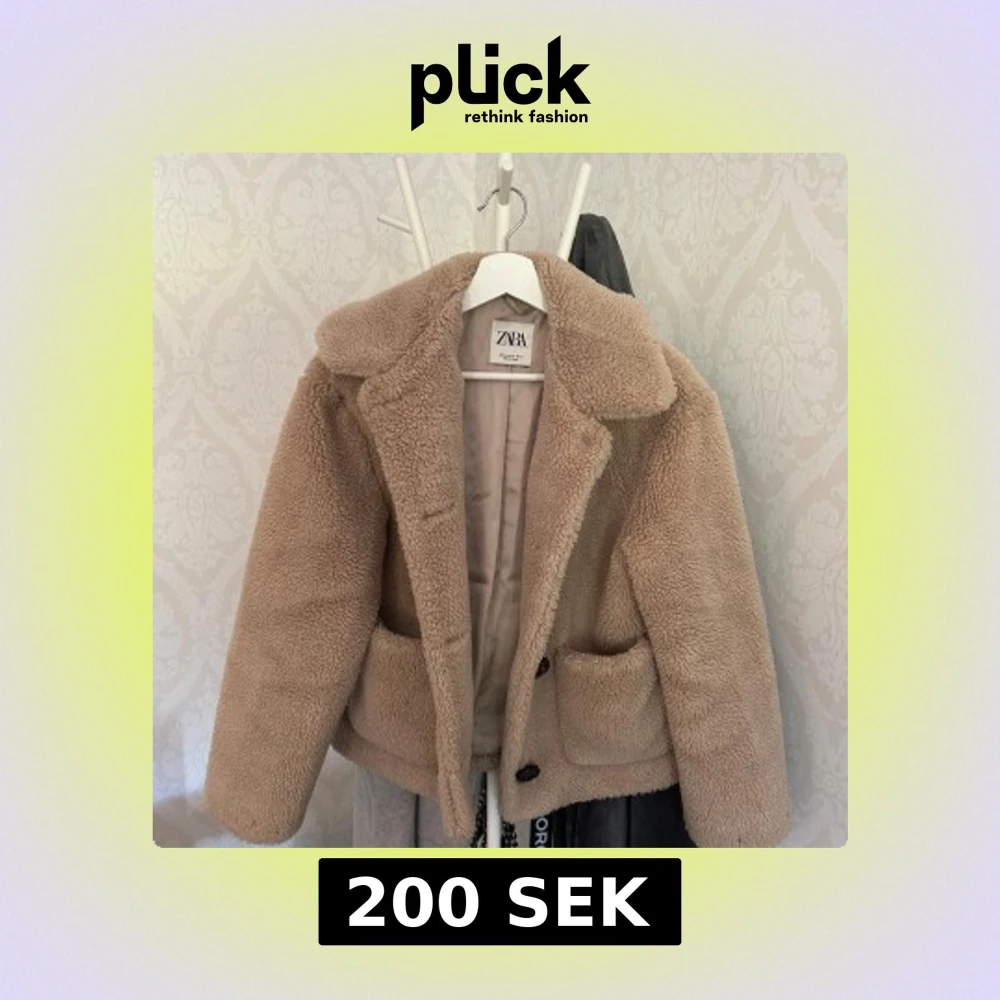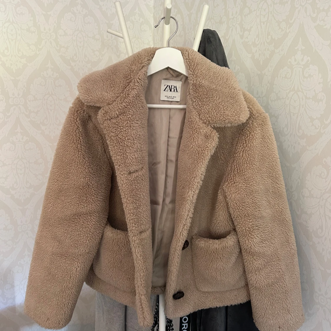 Supermjuk och fluffig teddyjacka från Zara i beige färg. Jackan har stora fickor framtill, bred krage och stängs med knappar. Perfekt för dig som vill ha en mysig och trendig look under kyliga dagar.