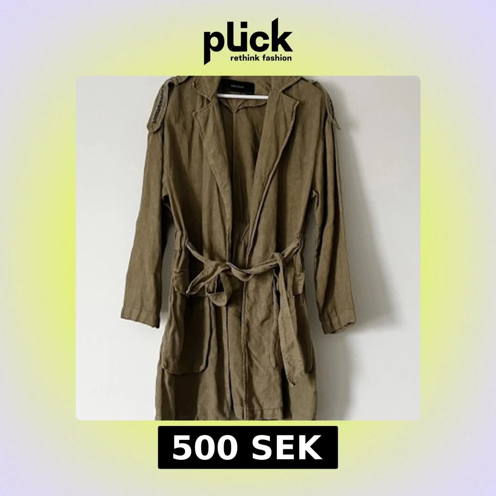 Snygg grön trenchcoat i linne. Jackan har långa ärmar och ett knytband i midjan för en justerbar passform. Den har dekorativa detaljer på axlarna och är perfekt för vår och höst. Storlek XS (S).
