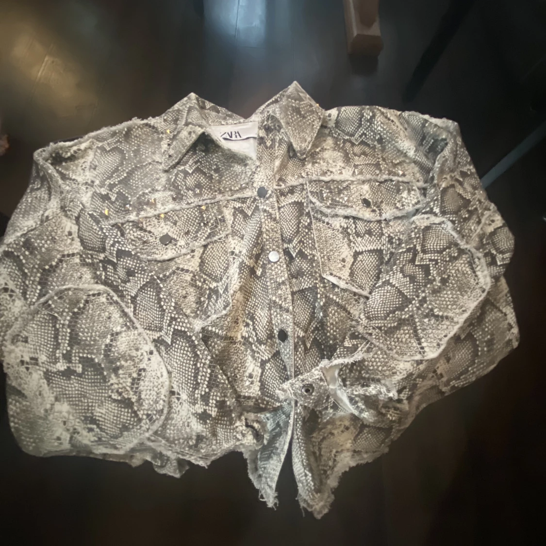 Den här jackan i ungefär jeansmaterial, den är köpt på Zara och bara andvänd en gång. Den har metall stenar som detalj, den är i väldigt fint skick. Jackan är i storlek S, den har längre bak än fram. Priset kan såklart diskuteras.