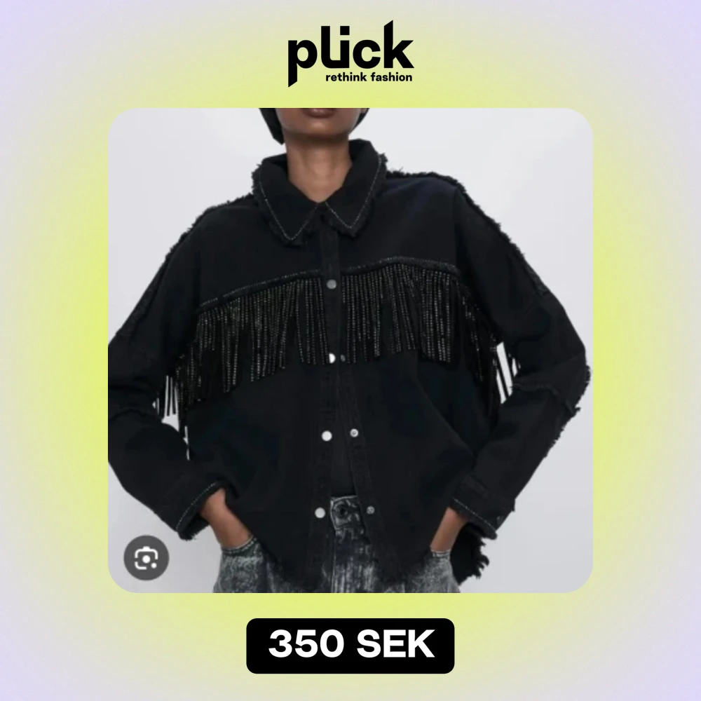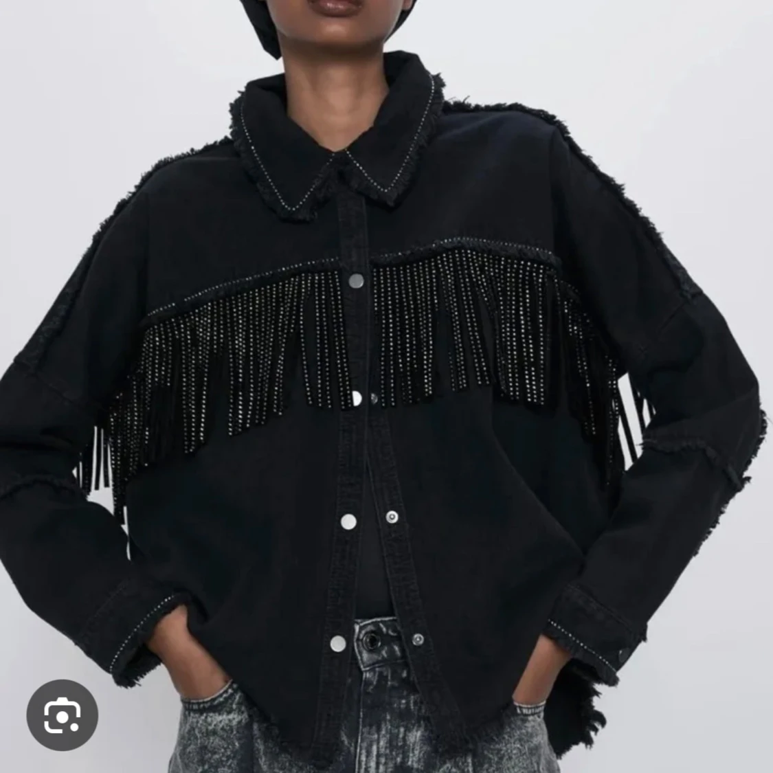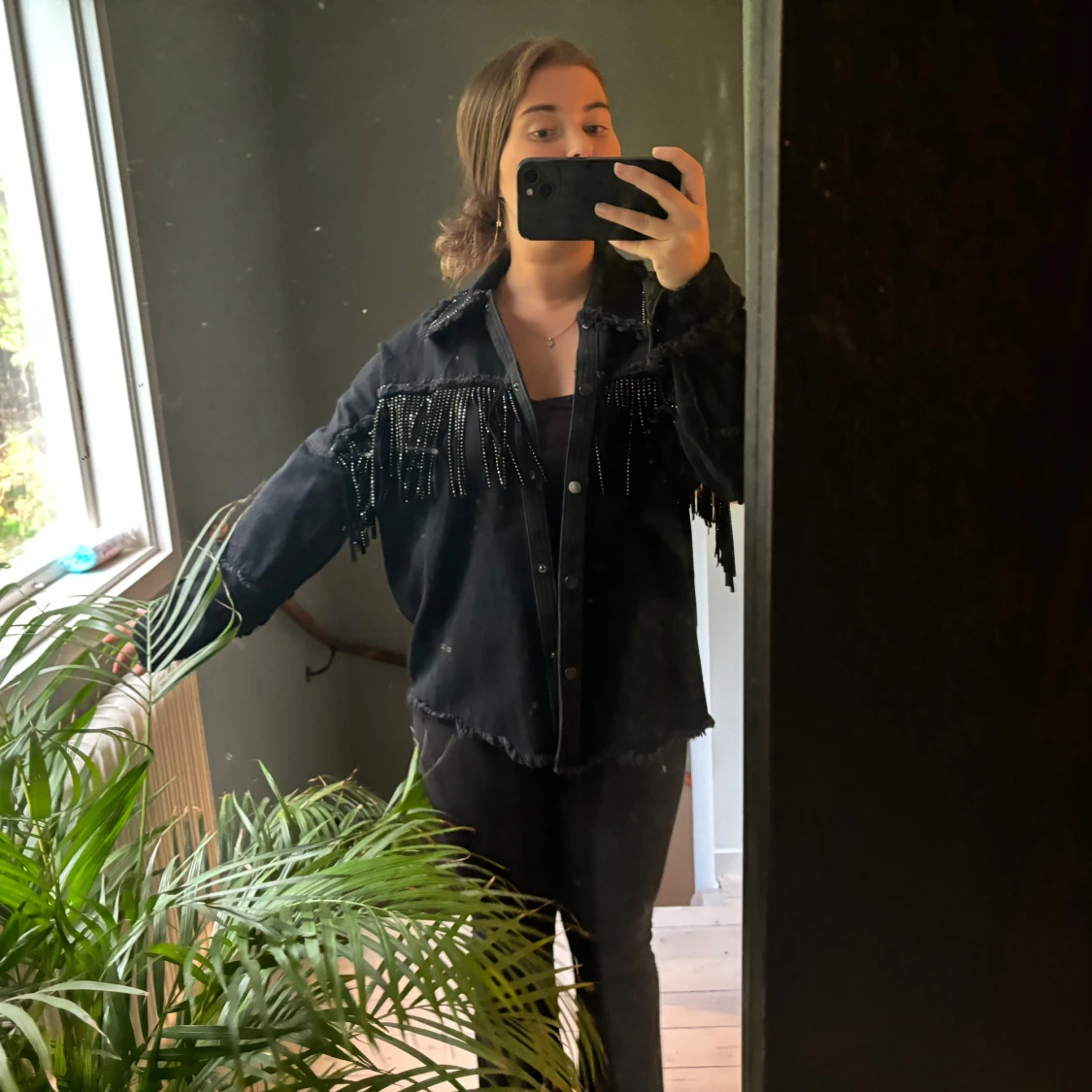 Så fin svart jacka med fransar, kommer aldrig till användning längre. Inge fläckar eller mm, nästan som ny. 🥰 Obs det är spegeln som e smutsig…