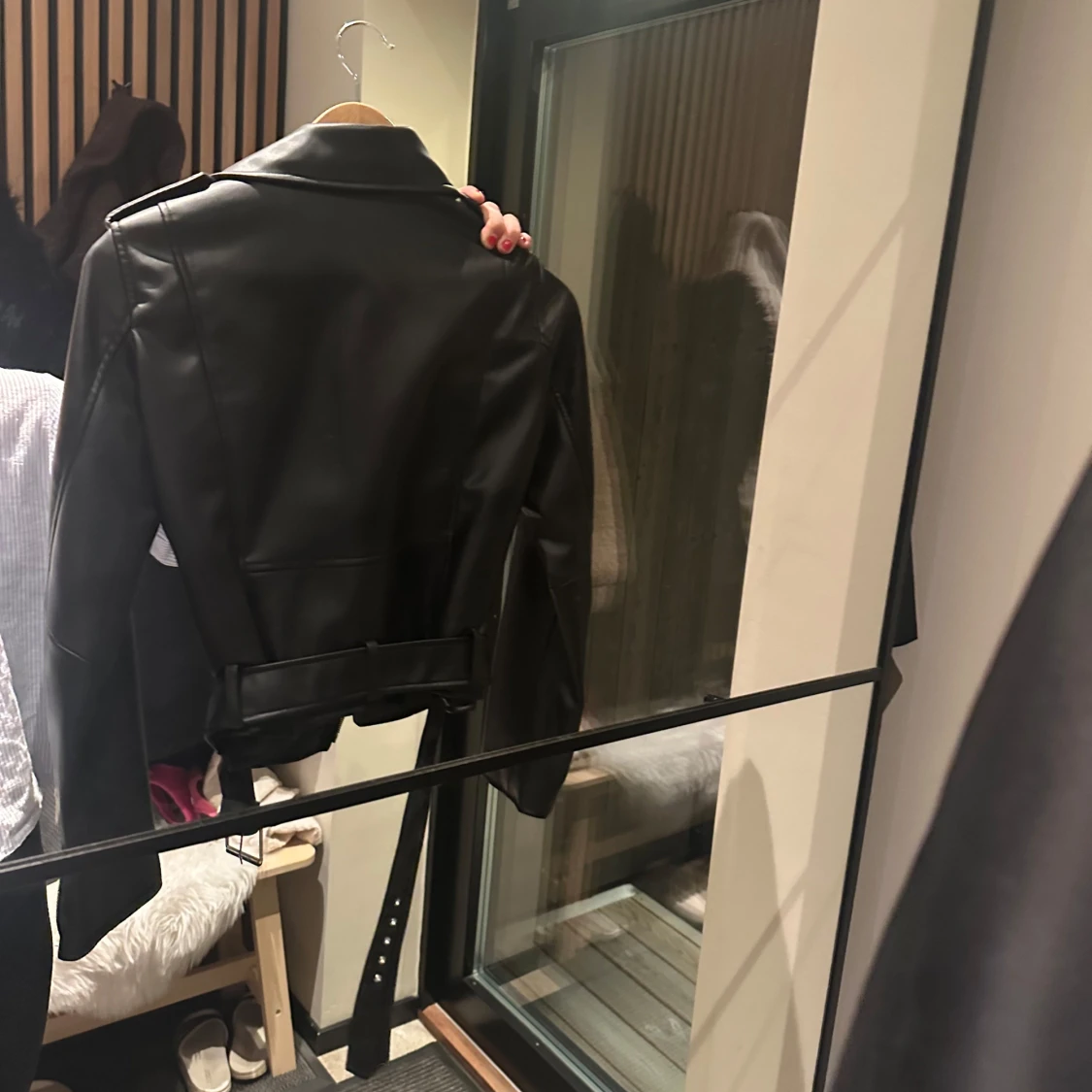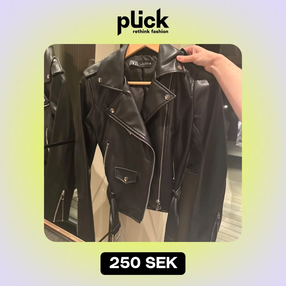 Säljer en snygg svart skinnjacka från Zara i mycket bra skick. Den har en cool bikerstil med dragkedja och knappar, samt ett bälte i midjan. Perfekt för höst och vår, och funkar lika bra till fest som till vardags. Jackan har långa ärmar och en klassisk krage.