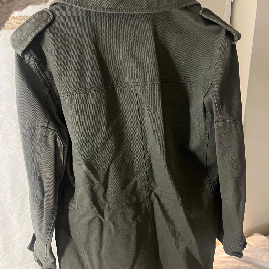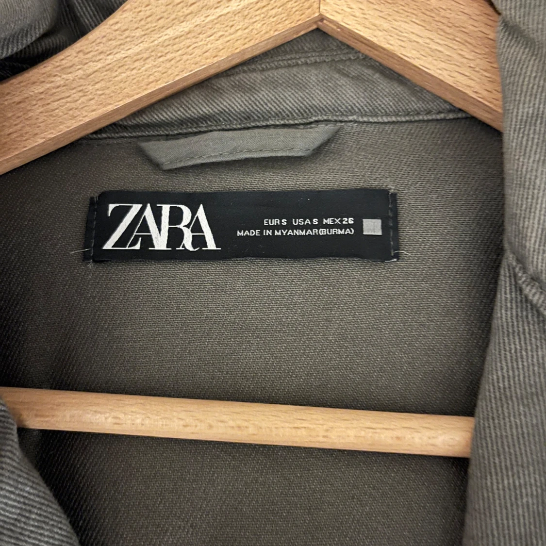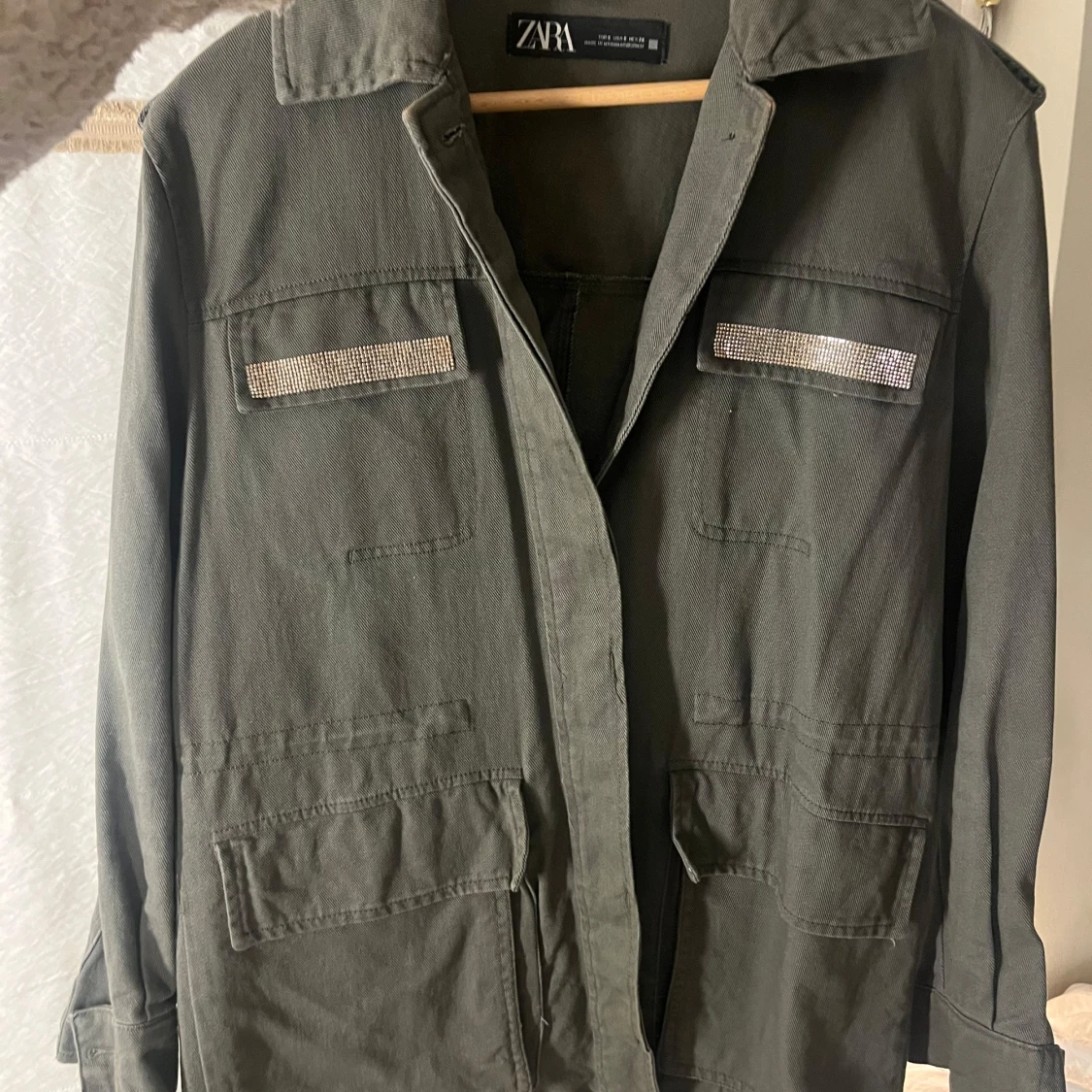 Snygg olivgrön jacka från Zara med långa ärmar och dekorativa detaljer på bröstfickorna. Jackan har en klassisk krage och flera praktiska fickor framtill. Perfekt för en stilren look.
