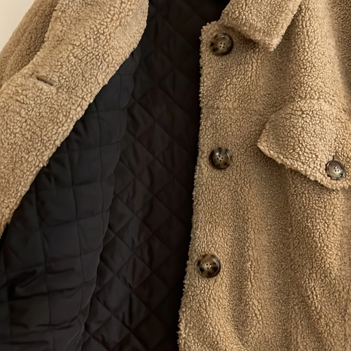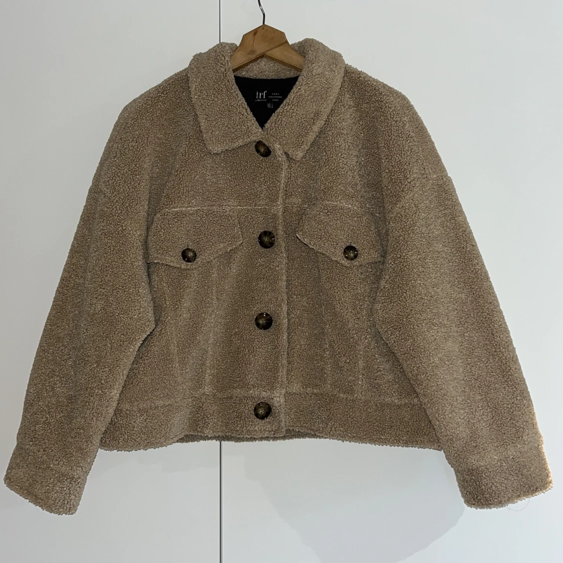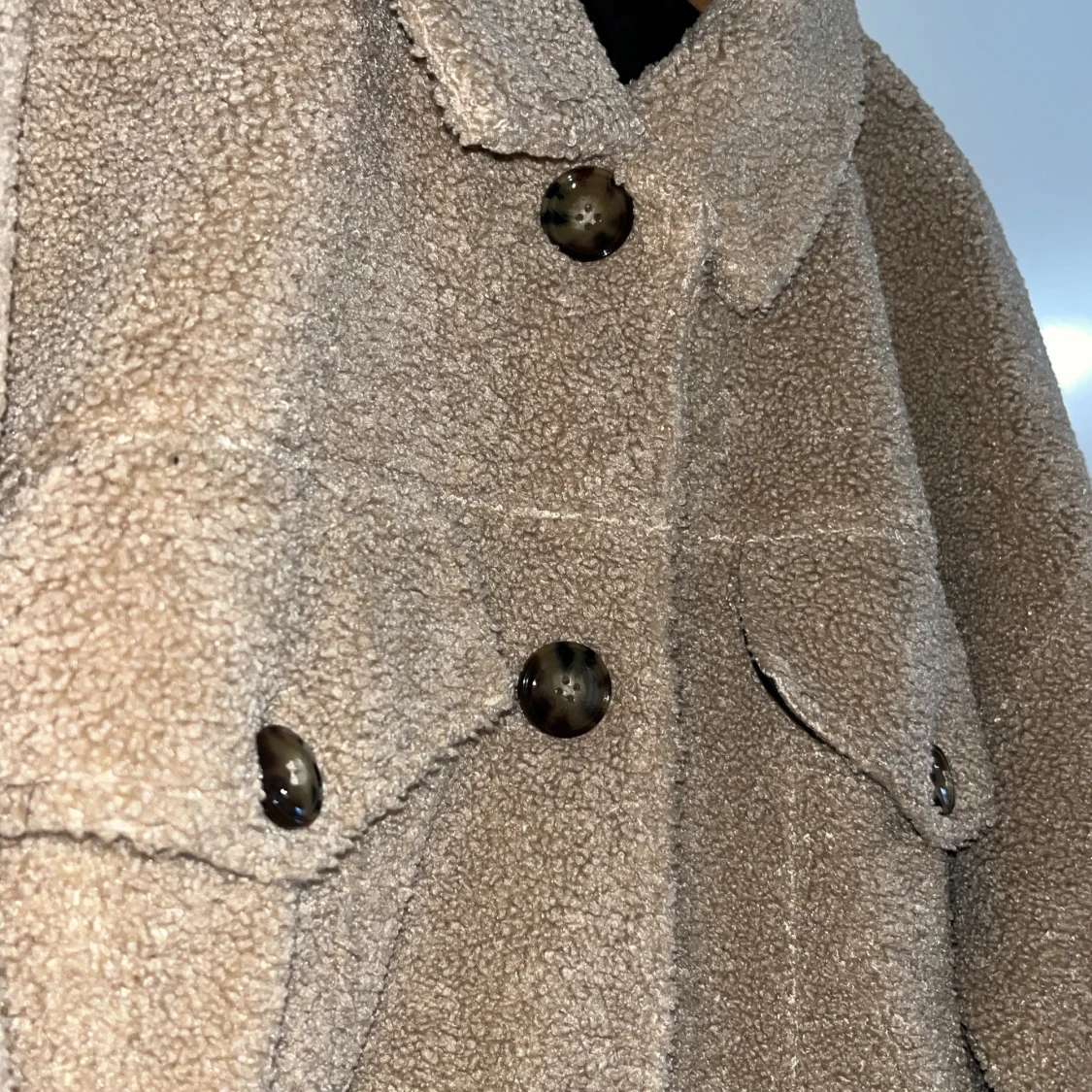 Mysig ljusbrun jacka i teddymaterial med fodring. Storlek L, men den är oversize, så passar även XL.