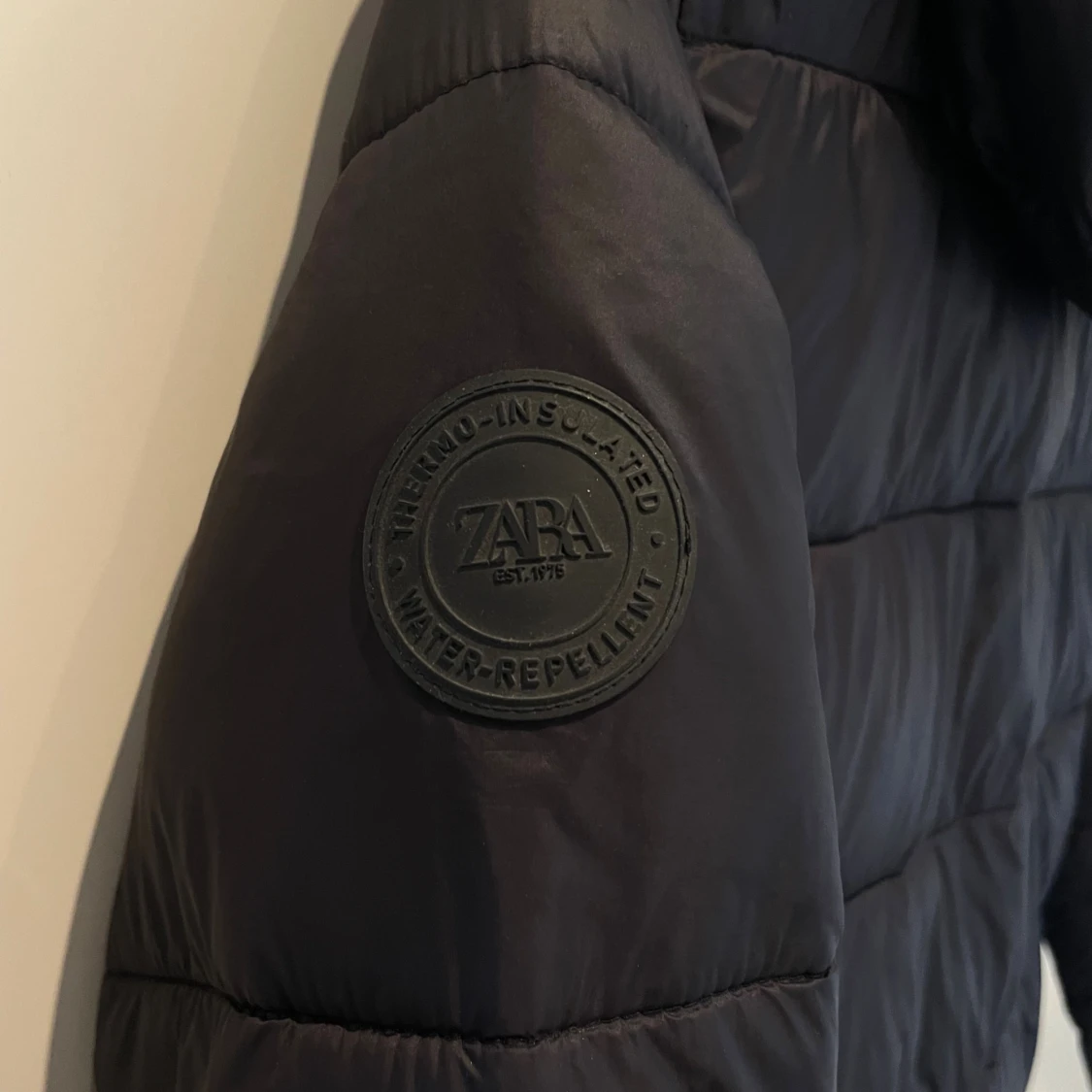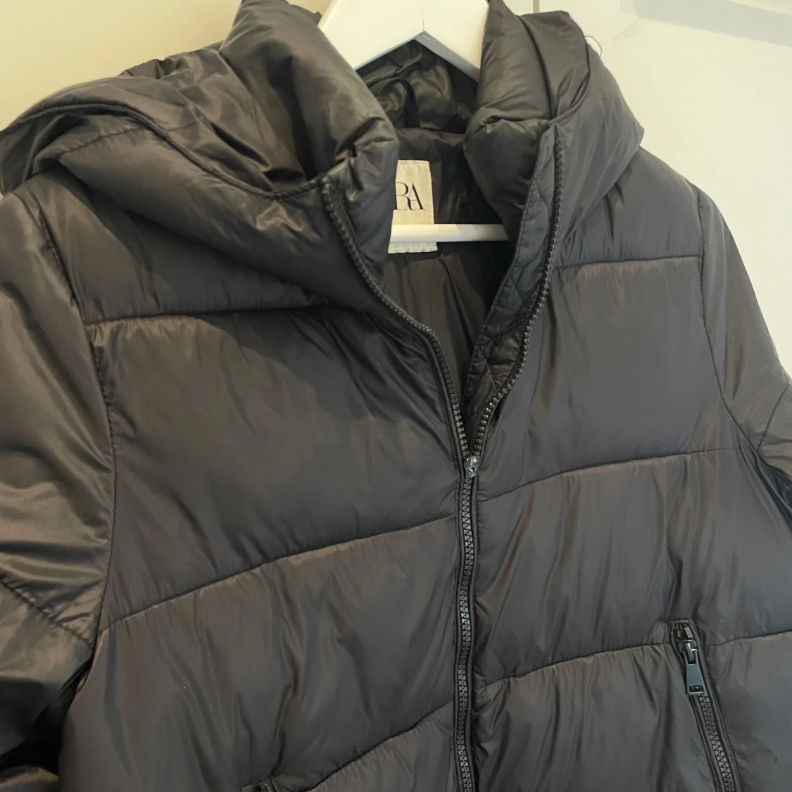 Säljer en svart pufferjacka från Zara i storlek S. Jackan har en stor och mysig huva, två fickor med dragkedja. Perfekt för kalla dagar när du vill hålla dig varm och ändå se stilren ut. sparsamt använd, nypris på omkring 700