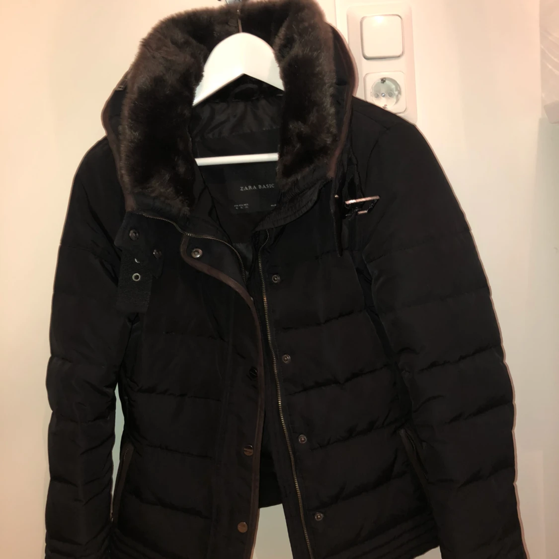 Svart jacka med bruna detaljer och fuskpäls i kragen. Flitigt men försiktigt använd och därför i väldigt fint skick. Köparen står för frakten.