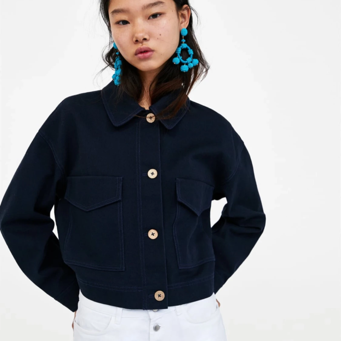 Mörkblå jacka från Zara. Oanvänd med prislapp kvar. Nypris: 349kr. Storlek L, (se bild hur den sitter på mig som vanligtvis har storlek s)