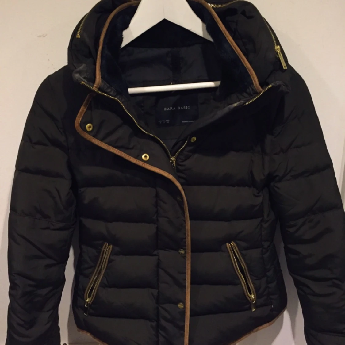 Knappt använd jacka från Zara. Mörkbrun med fuskpäls på insidan av kragen.