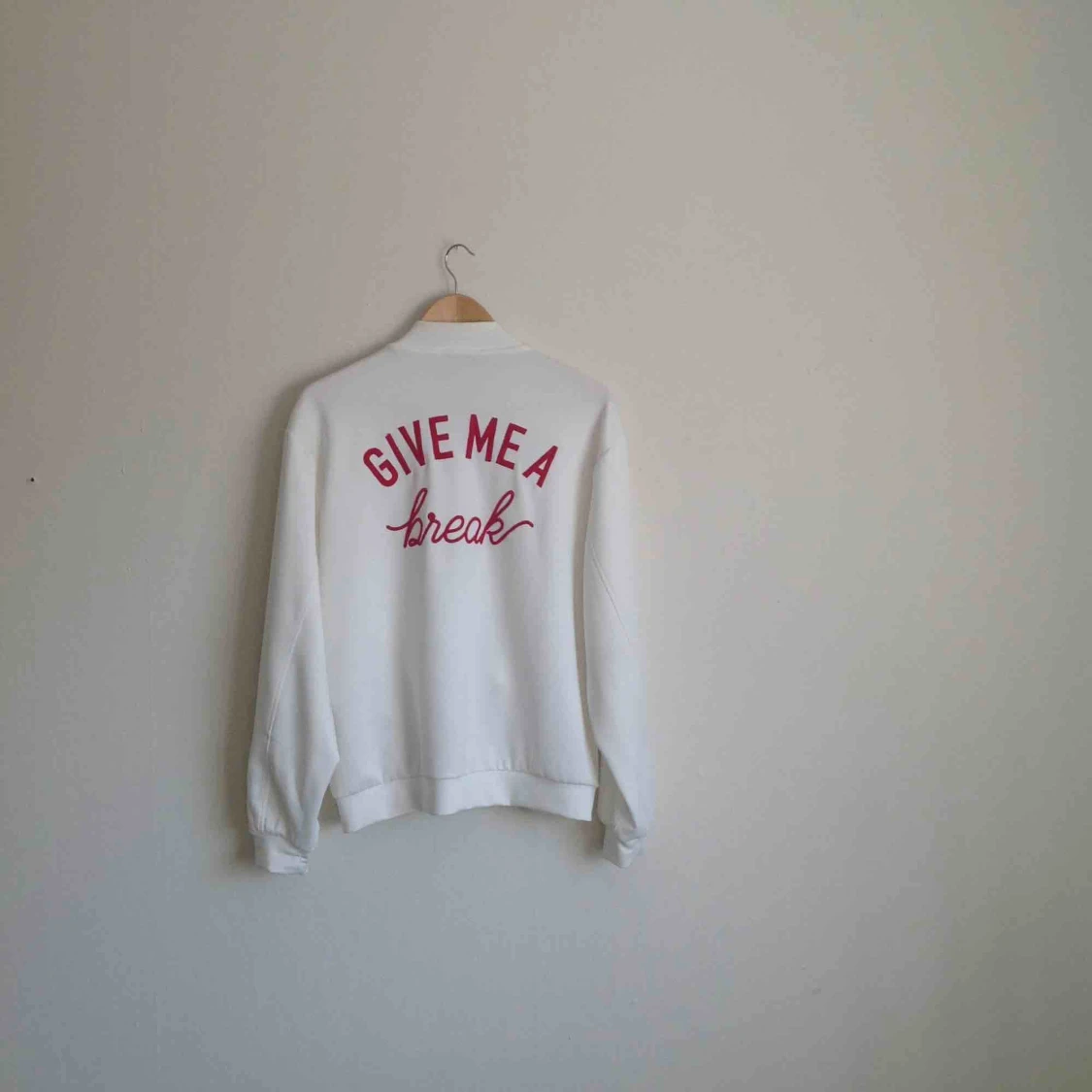 Tunn bomberjacka från Zara med texten "Give me a break" broderad på ryggen. Använd endast ett fåtal gånger och är i mycket bra skick. Frakten ingår ☀️