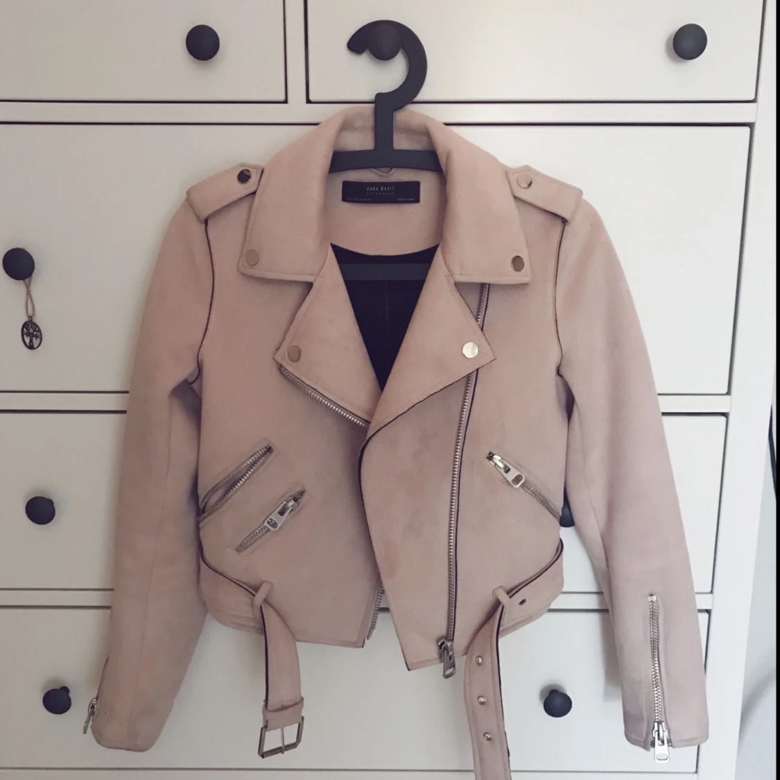 Ljusrosa ”Mocka” jacka från ZARA. Den är i använt skick och har några fläckar, syns dock inte lika mycket i verkligheten. Ser ut som den ska vara lite ojämn i färgen så fläckarna smälter in! Kan mötas upp men även frakta!