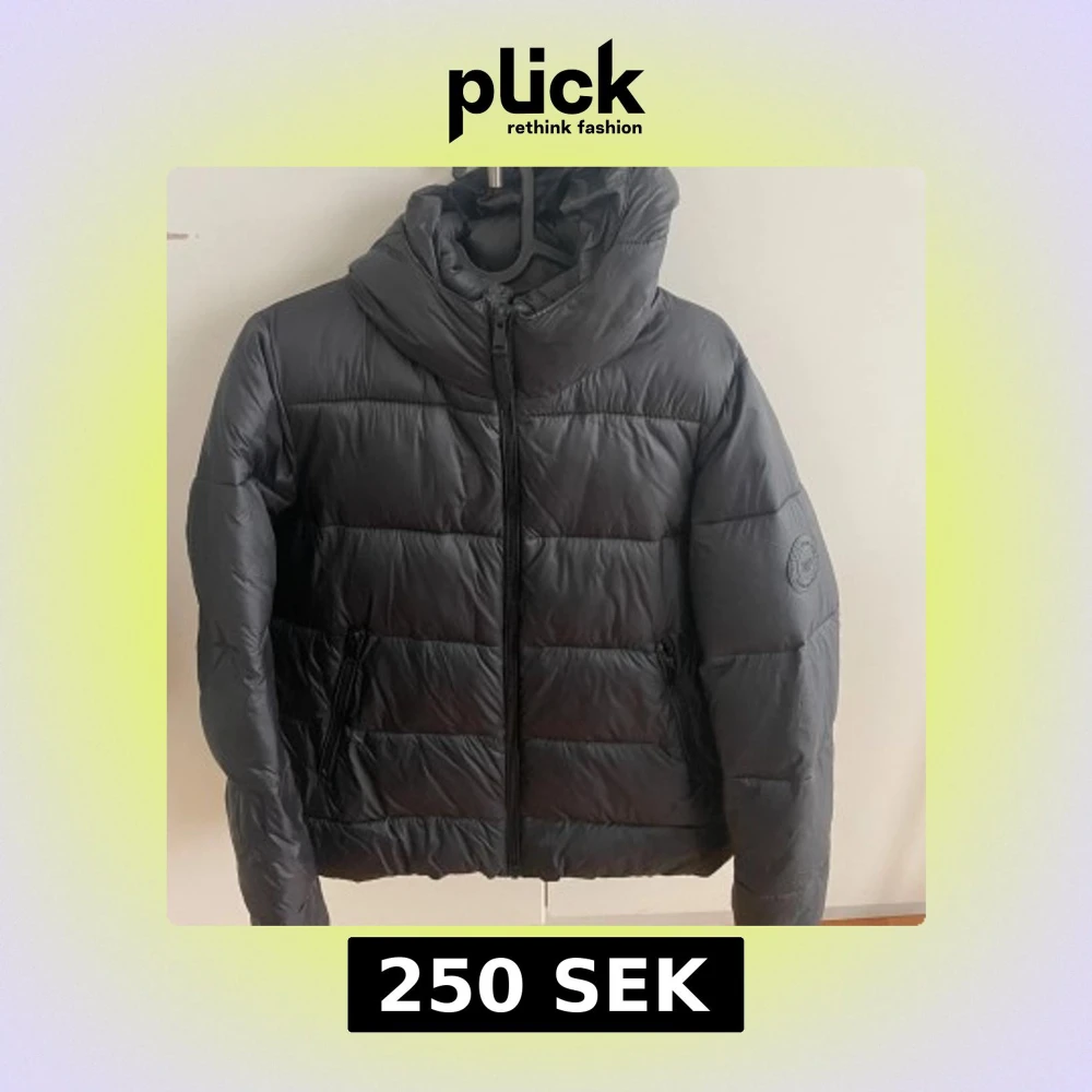 Säljer en stilren svart dunjacka med huva. Jackan har dragkedja framtill och är perfekt för kyliga dagar. Den är långärmad och har en diskret logga på ärmen. Passar bra för både höst och vinter. Är från zara i storlek S🥰