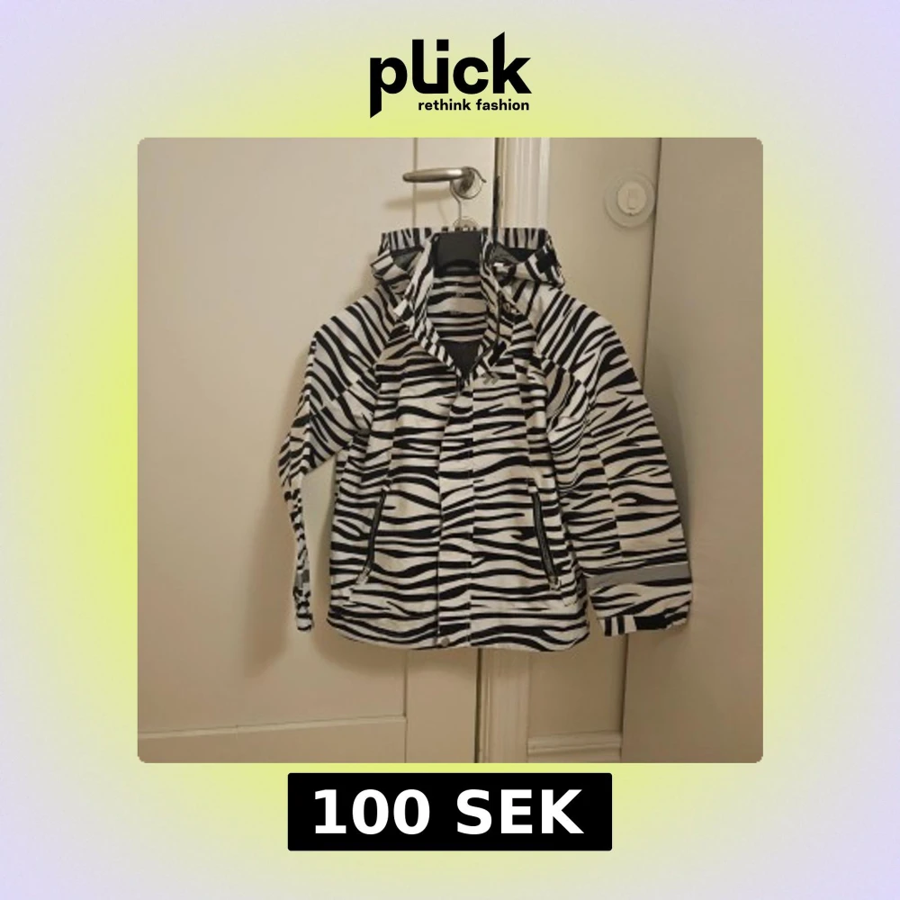 Snygg regnjacka från Funk i storlek 140 med svartvita zebraränder. Jackan har huva, dragkedja och två fickor med dragkedjor. Perfekt för dig som vill sticka ut med ett coolt mönster även när det regnar.